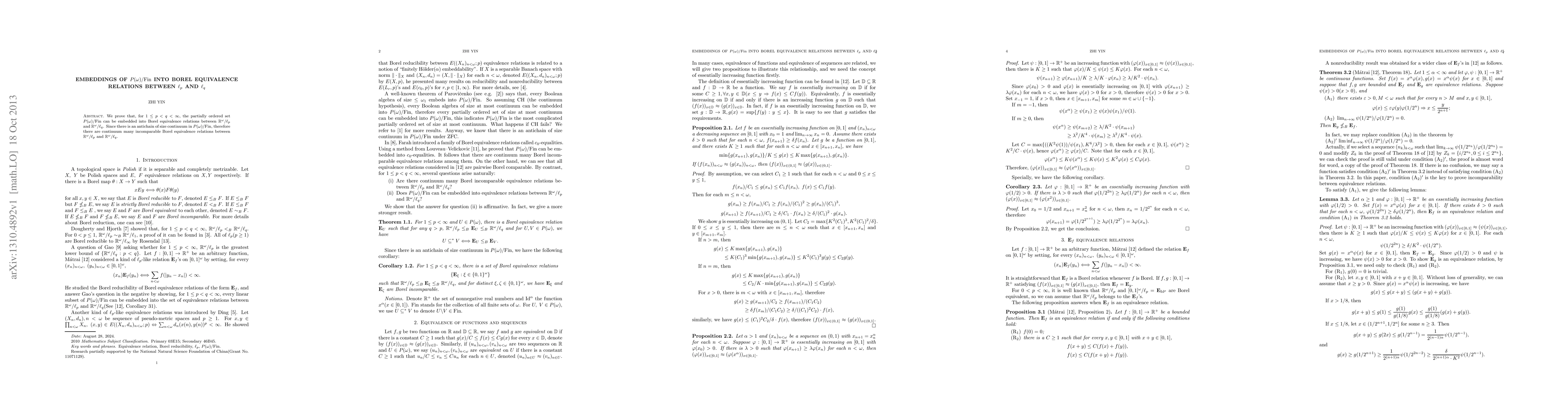 This paper proves that $P( ext{omega})/ ext{Fin}$ can be embedded into Borel equivalence relations between $ ext{R}^ ext{omega}/ ext{l}_p$ and $ ext{R}^ ext{omega}/ ext{l}_q$, leading to continuum many incomparable relations.