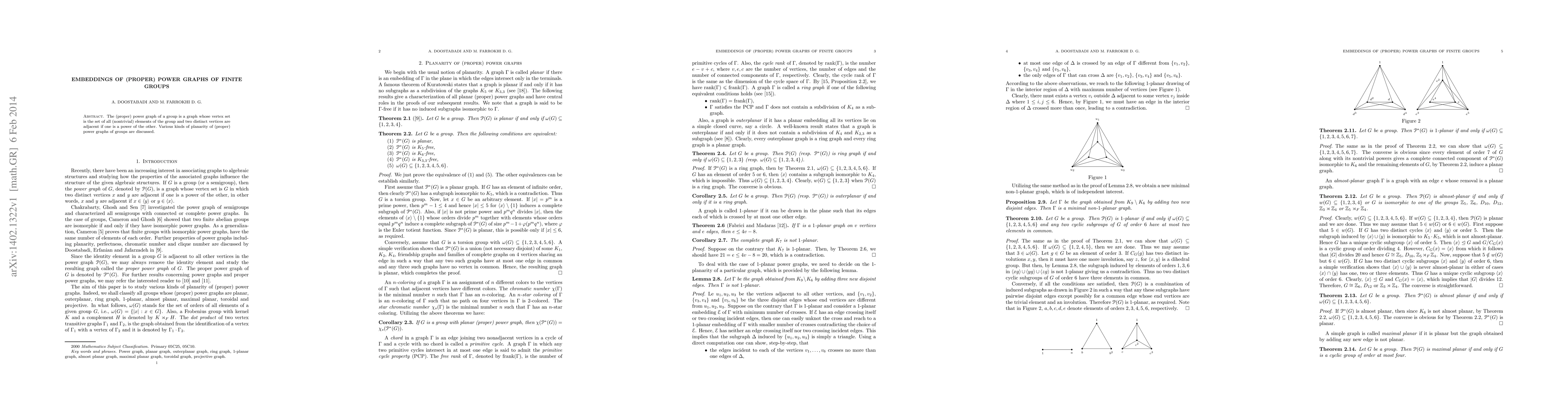 Summary: This paper explores the (proper) power graphs of finite groups, where vertices represent nontrivial elements and edges exist if one element is a power of another. It investigates various types of planarity in these graphs.