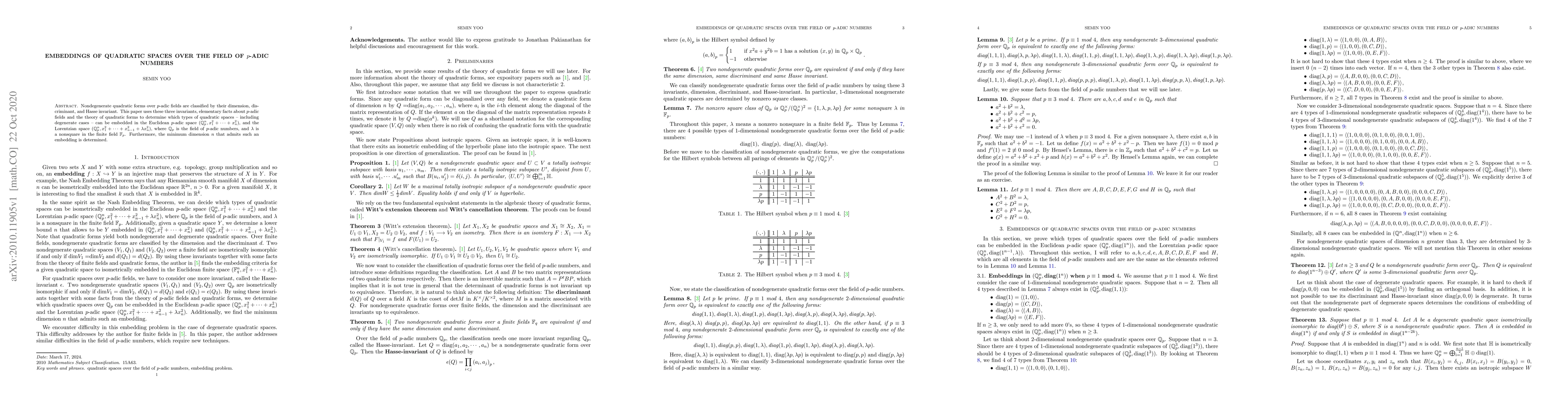 This paper classifies nondegenerate quadratic forms over $p$-adic fields and determines which quadratic spaces can be embedded in Euclidean and Lorentzian $p$-adic spaces, finding the minimum dimension for such embeddings.