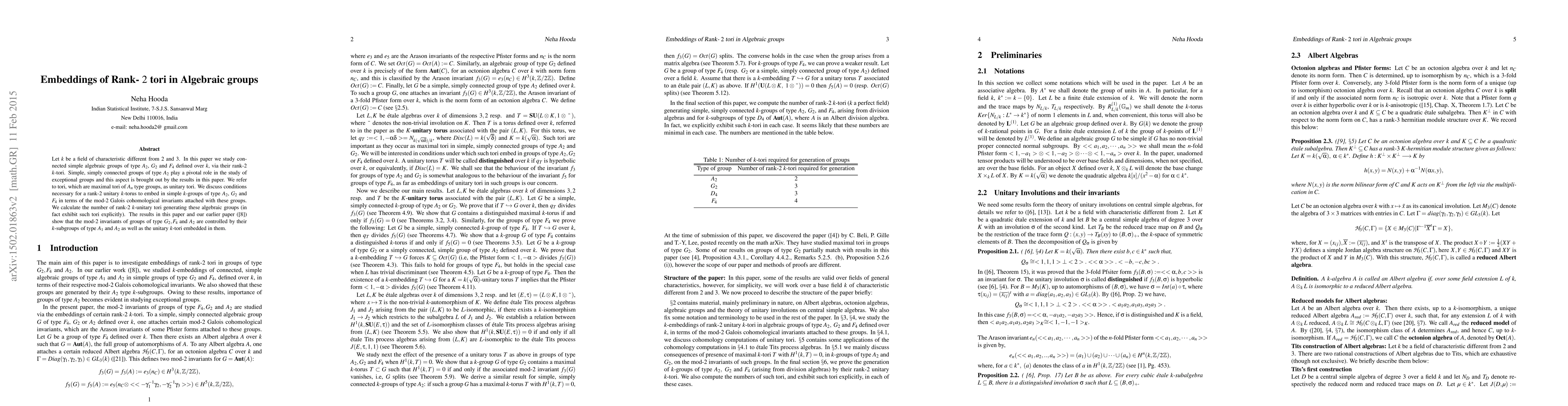 This paper investigates embeddings of rank-2 tori (unitary tori) in algebraic groups of types $A_2$, $G_2$, and $F_4$ over fields $k$ of characteristic different from $2$ and $3$. It establishes conditions for embedding based on mod-2 Galois cohomological invariants and calculates the number of such rank-2 tori generating the groups, showing that mod-2 invariants are controlled by subgroups of types $A_1$, $A_2$, and embedded unitary $k$-tori.