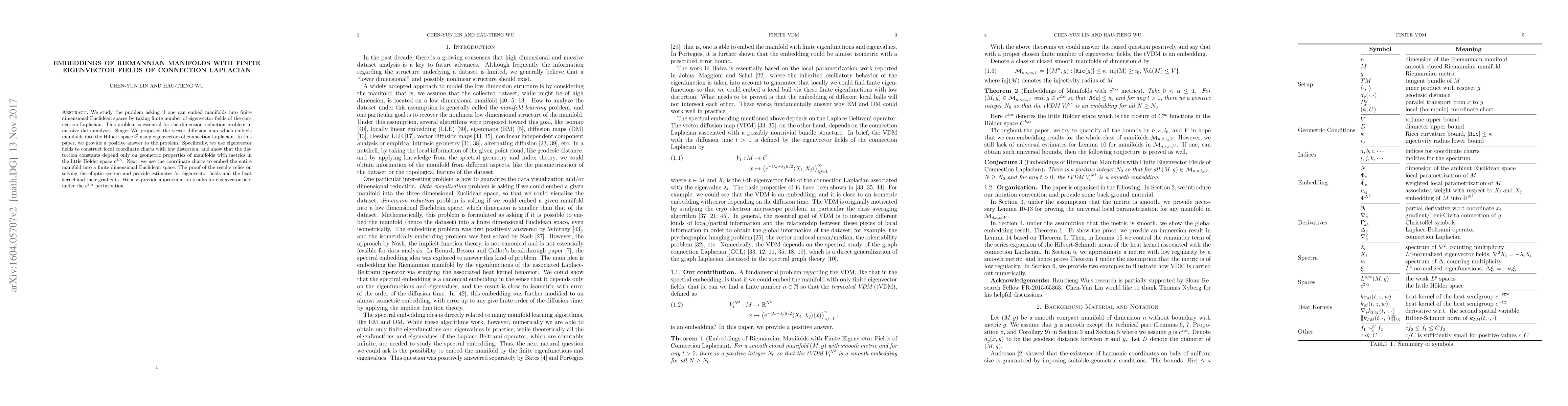 This paper demonstrates that Riemannian manifolds can be embedded into finite-dimensional Euclidean spaces using a finite number of eigenvector fields from the connection Laplacian, addressing dimension reduction in data analysis. The authors construct local coordinate charts with low distortion based on these eigenvectors and prove that the distortion depends on the manifold's geometric properties.