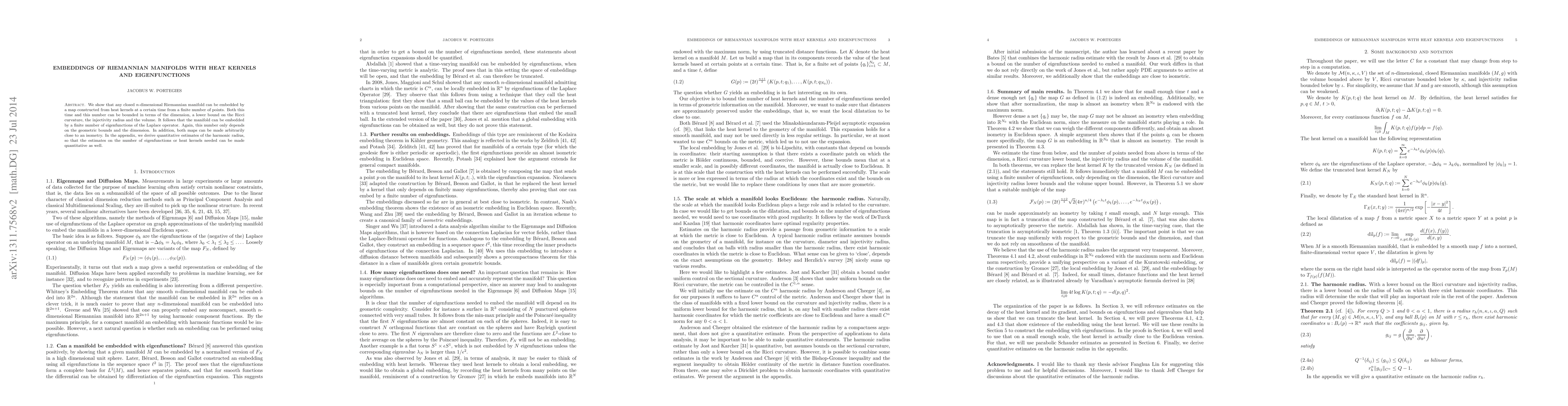 A new method to embed closed Riemannian manifolds into Euclidean space using heat kernels and eigenfunctions is developed, with the number of points or time required bound by geometric parameters.