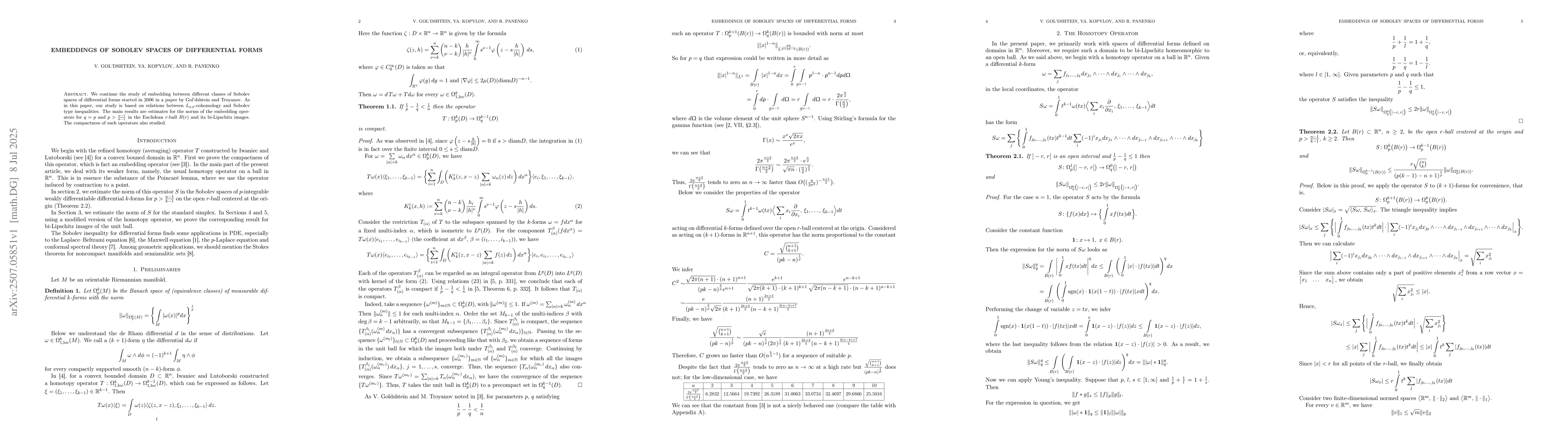 We continue the~study of embedding between different classes of Sobolev spaces of differential forms started in 2006 in a~paper by Gol'dshtein and Troyanov. As in this paper, our study is based on relations between $L_{q,p}$-cohomology and Sobolev type inequalities. The~main results are estimates for the norms of the embedding operators for $q=p$ and $p>\frac{n-1}{k-1}$ in the~Euclidean $r$-ball $B(r)$ and its bi-Lipschitz images. The~compactness of such operators also studied.