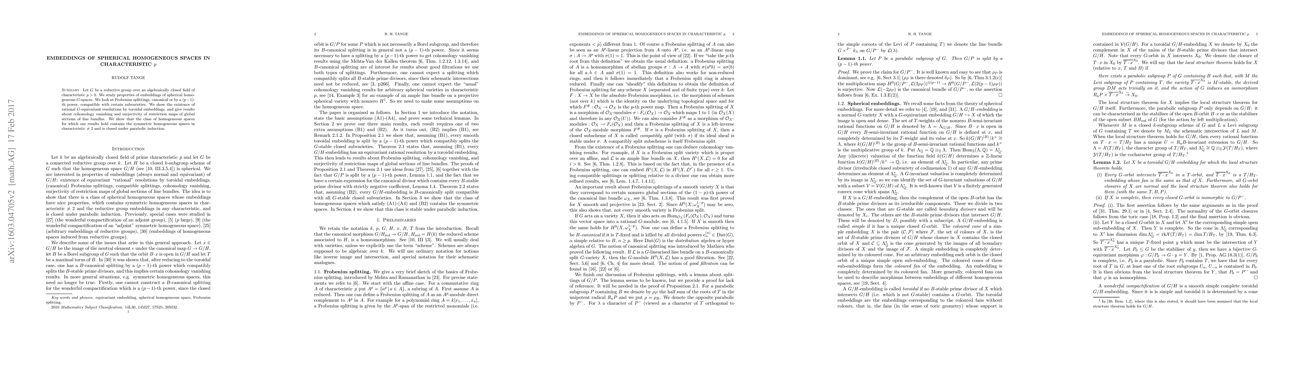 This paper investigates embeddings of spherical homogeneous spaces for reductive groups in fields of characteristic p>0, focusing on Frobenius splittings and cohomology vanishing, and proves the existence of rational G-equivariant resolutions via toroidal embeddings. The results apply to symmetric homogeneous spaces and are preserved under parabolic induction.