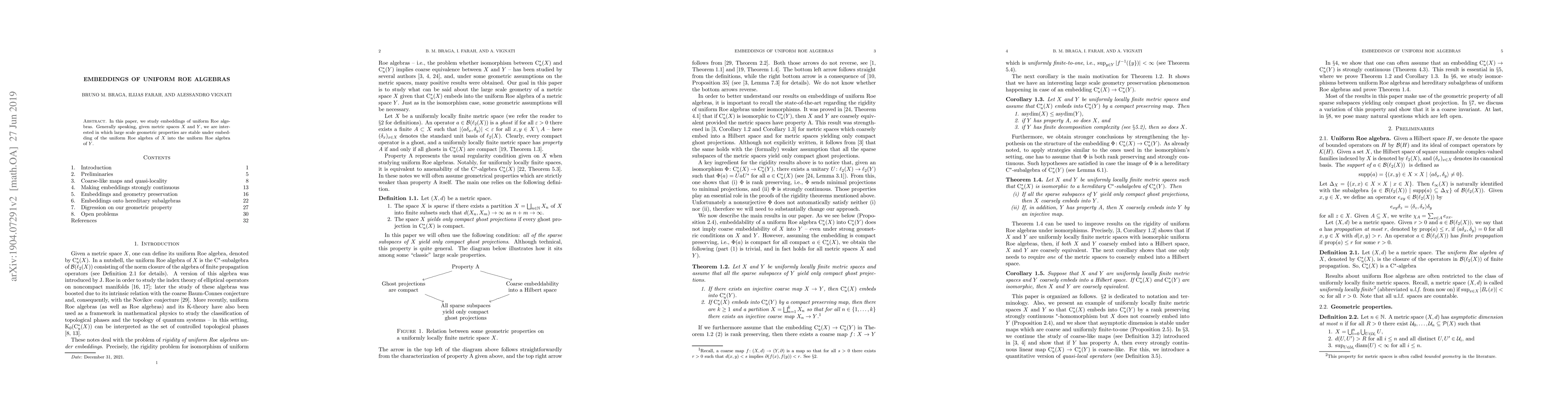 Summary: This paper investigates the stability of large-scale geometric properties under embeddings of uniform Roe algebras between metric spaces, focusing on which properties remain invariant when the uniform Roe algebra of one space is embedded into that of another.