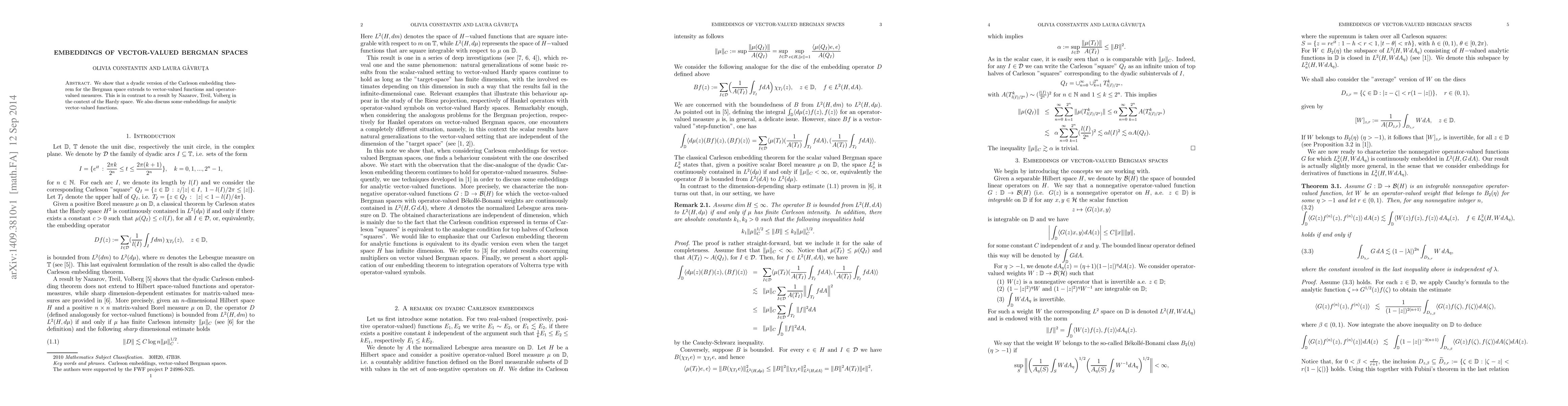 We remark that a dyadic version of the Carleson embedding theorem for the Bergman space extends to vector-valued functions and operator-valued measures. This is in contrast to a result by Nazarov, Treil, Volberg in the context of the Hardy space. We also discuss some embeddings for analytic vector-valued functions.