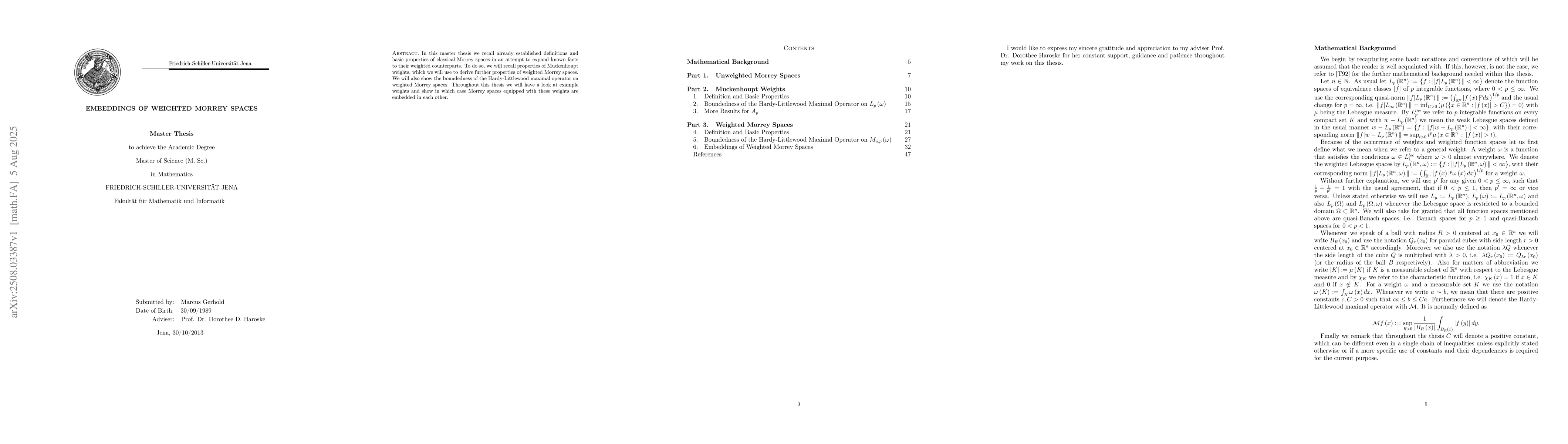 In this master thesis we recall already established definitions and basic properties of classical Morrey spaces in an attempt to expand known facts to their weighted counterparts. To do so, we will recall properties of Muckenhoupt weights, which we will use to derive further properties of weighted Morrey spaces. We will also show the boundedness of the Hardy-Littlewood maximal operator on weighted Morrey spaces. Throughout this thesis we will have a look at example weights and show in which case Morrey spaces equipped with these weights are embedded in each other.