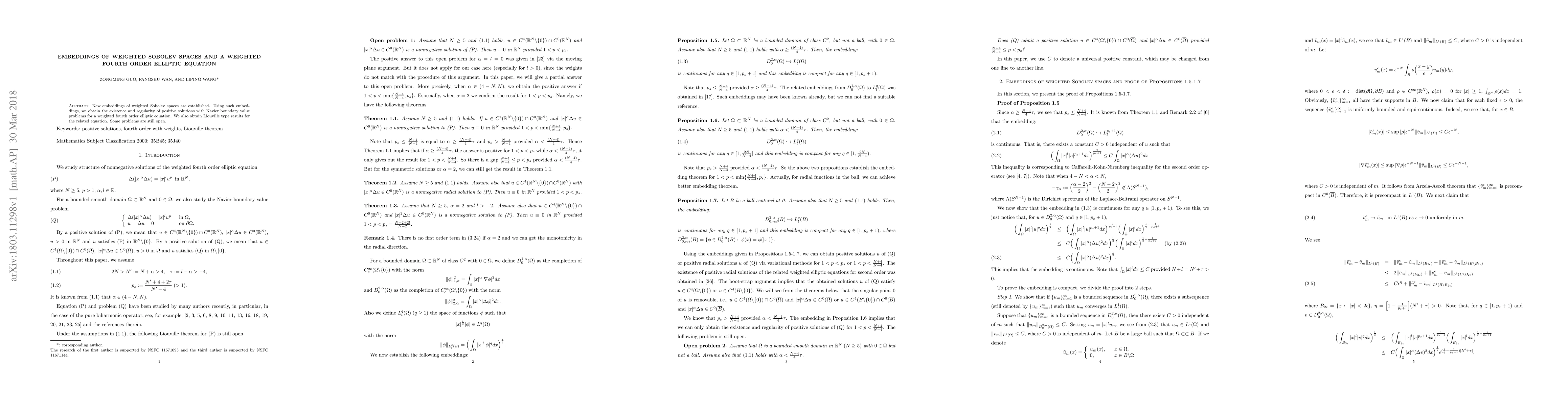 New embeddings of weighted Sobolev spaces are established. Using such embeddings, we obtain the existence and regularity of positive solutions with Navier boundary value problems for a weighted fourth order elliptic equation. We also obtain Liouville type results for the related equation. Some problems are still open.