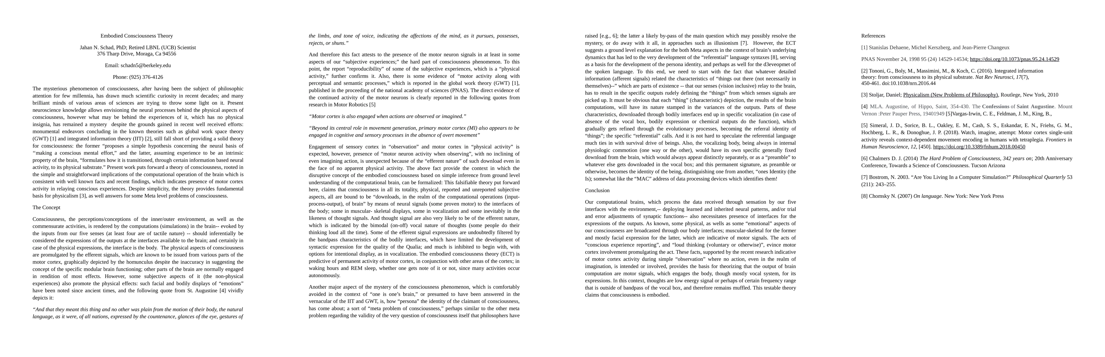 The Embodied Consciousness Theory proposes that the motor cortex plays a key role in relaying conscious experiences, offering a straightforward explanation consistent with recent neuroscience findings and addressing fundamental physicalism and meta-level consciousness problems.