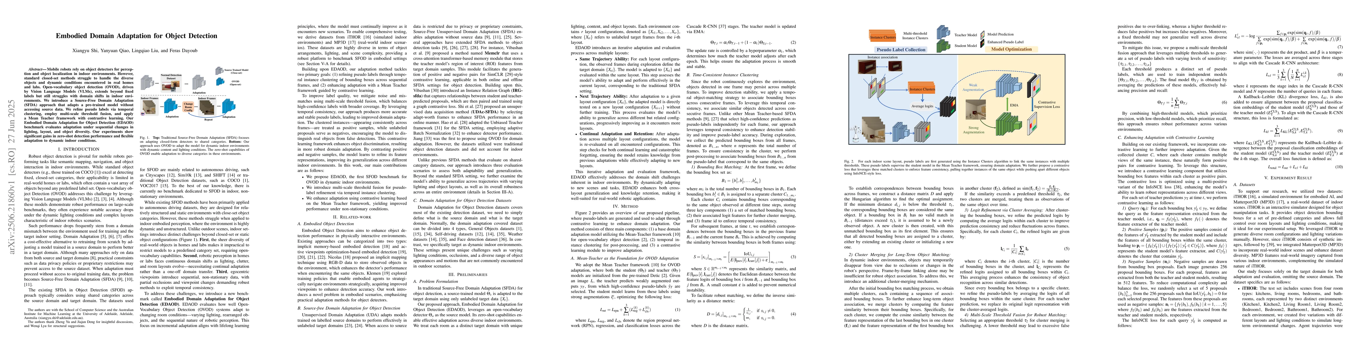 Mobile robots rely on object detectors for perception and object localization in indoor environments. However, standard closed-set methods struggle to handle the diverse objects and dynamic conditions encountered in real homes and labs. Open-vocabulary object detection (OVOD), driven by Vision Language Models (VLMs), extends beyond fixed labels but still struggles with domain shifts in indoor environments. We introduce a Source-Free Domain Adaptation (SFDA) approach that adapts a pre-trained model without accessing source data. We refine pseudo labels via temporal clustering, employ multi-scale threshold fusion, and apply a Mean Teacher framework with contrastive learning. Our Embodied Domain Adaptation for Object Detection (EDAOD) benchmark evaluates adaptation under sequential changes in lighting, layout, and object diversity. Our experiments show significant gains in zero-shot detection performance and flexible adaptation to dynamic indoor conditions.