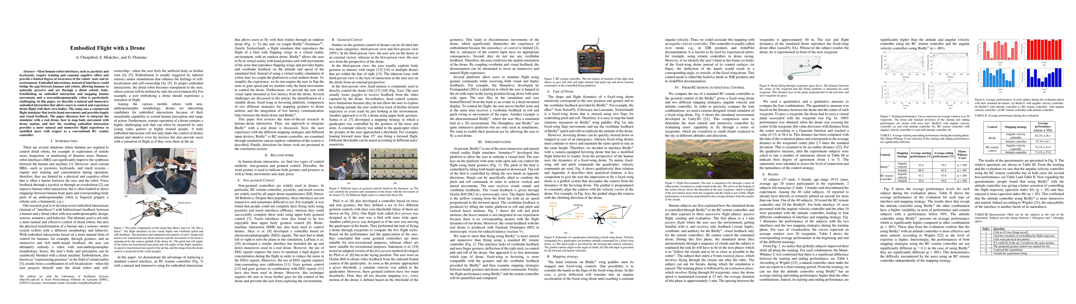 Most human-robot interfaces, such as joysticks and keyboards, require training and constant cognitive effort and provide a limited degree of awareness of the robots state and its environment. Embodied interactions, instead of interfaces, could bridge the gap between humans and robots, allowing humans to naturally perceive and act through a distal robotic body. Establishing an embodied interaction and mapping human movements and a non-anthropomorphic robot is particularly challenging. In this paper, we describe a natural and immersive embodied interaction that allows users to control and experience drone flight with their own bodies. The setup uses a commercial flight simulator that tracks hand movements and provides haptic and visual feedback. The paper discusses how to integrate the simulator with a real drone, how to map body movement with drone motion, and how the resulting embodied interaction provides a more natural and immersive flight experience to unskilled users with respect to a conventional RC remote controller.