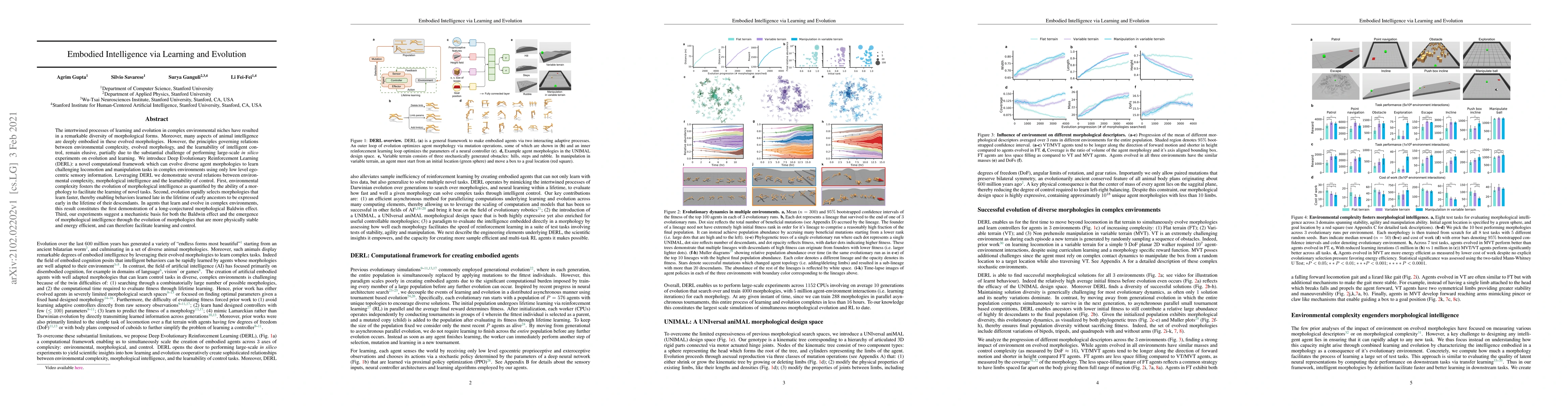 Researchers developed a new framework to study evolution of intelligent agents in complex environments, finding that environmental complexity can lead to faster learning and the emergence of morphological intelligence.