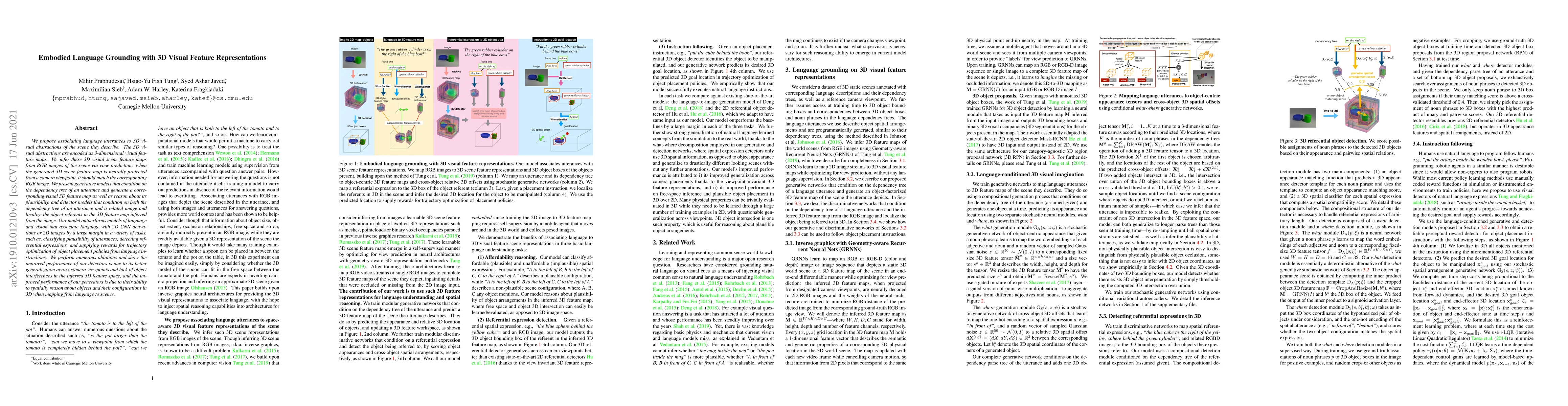 We propose associating language utterances to 3D visual abstractions of the scene they describe. The 3D visual abstractions are encoded as 3-dimensional visual feature maps. We infer these 3D visual scene feature maps from RGB images of the scene via view prediction: when the generated 3D scene feature map is neurally projected from a camera viewpoint, it should match the corresponding RGB image. We present generative models that condition on the dependency tree of an utterance and generate a corresponding visual 3D feature map as well as reason about its plausibility, and detector models that condition on both the dependency tree of an utterance and a related image and localize the object referents in the 3D feature map inferred from the image. Our model outperforms models of language and vision that associate language with 2D CNN activations or 2D images by a large margin in a variety of tasks, such as, classifying plausibility of utterances, detecting referential expressions, and supplying rewards for trajectory optimization of object placement policies from language instructions. We perform numerous ablations and show the improved performance of our detectors is due to its better generalization across camera viewpoints and lack of object interferences in the inferred 3D feature space, and the improved performance of our generators is due to their ability to spatially reason about objects and their configurations in 3D when mapping from language to scenes.