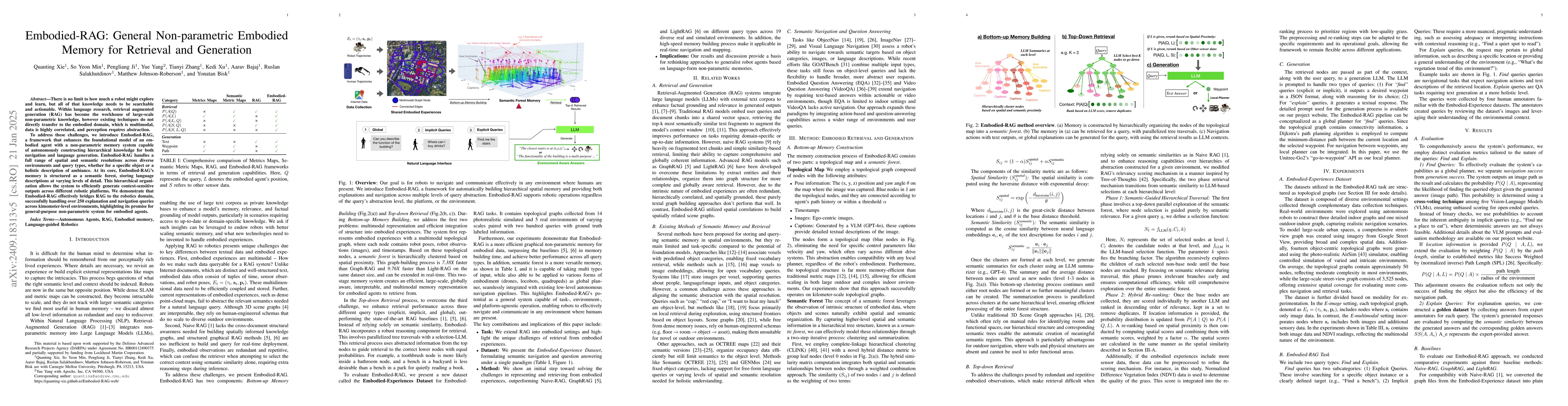 Embodied-RAG introduces a non-parametric memory system for embodied agents, integrating hierarchical semantic forests to facilitate efficient retrieval and generation across diverse environments and queries. It demonstrates success in handling complex spatial and semantic tasks, showcasing its potential as a general-purpose solution for robotic systems.