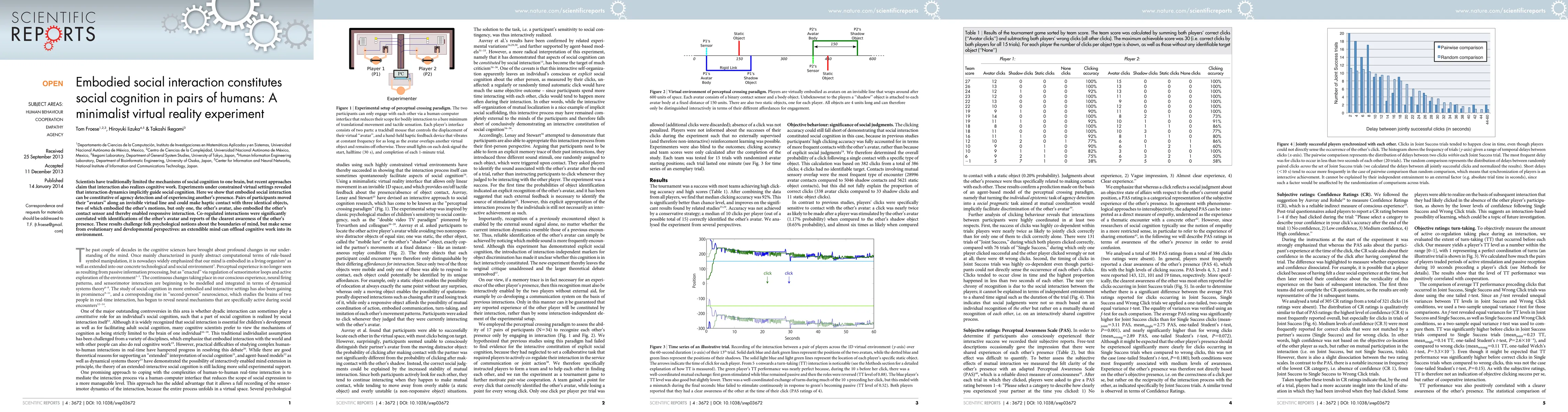 This paper demonstrates that embodied social interaction in a virtual reality setting can constitute social cognition, showing that co-regulated interactions enhance agency detection and presence awareness. The study supports the idea that cognitive processes can extend beyond individual brains through interaction.