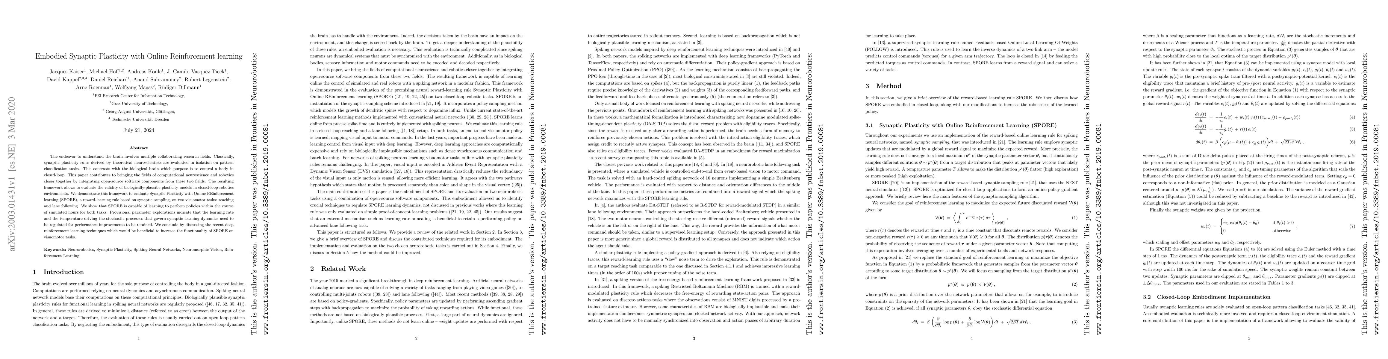 This paper integrates computational neuroscience and robotics to evaluate biologically-plausible synaptic plasticity models in closed-loop environments, demonstrating the effectiveness of SPORE on visuomotor tasks. It highlights the importance of regulating learning rate and temperature for sustained performance improvements.