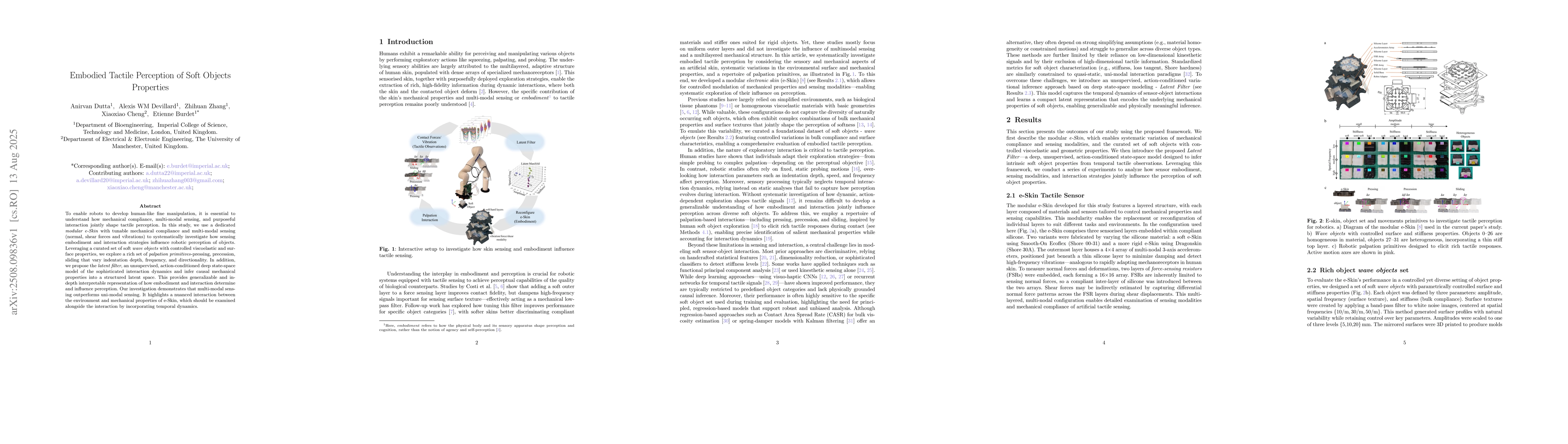 To enable robots to develop human-like fine manipulation, it is essential to understand how mechanical compliance, multi-modal sensing, and purposeful interaction jointly shape tactile perception. In this study, we use a dedicated modular e-Skin with tunable mechanical compliance and multi-modal sensing (normal, shear forces and vibrations) to systematically investigate how sensing embodiment and interaction strategies influence robotic perception of objects. Leveraging a curated set of soft wave objects with controlled viscoelastic and surface properties, we explore a rich set of palpation primitives-pressing, precession, sliding that vary indentation depth, frequency, and directionality. In addition, we propose the latent filter, an unsupervised, action-conditioned deep state-space model of the sophisticated interaction dynamics and infer causal mechanical properties into a structured latent space. This provides generalizable and in-depth interpretable representation of how embodiment and interaction determine and influence perception. Our investigation demonstrates that multi-modal sensing outperforms uni-modal sensing. It highlights a nuanced interaction between the environment and mechanical properties of e-Skin, which should be examined alongside the interaction by incorporating temporal dynamics.
