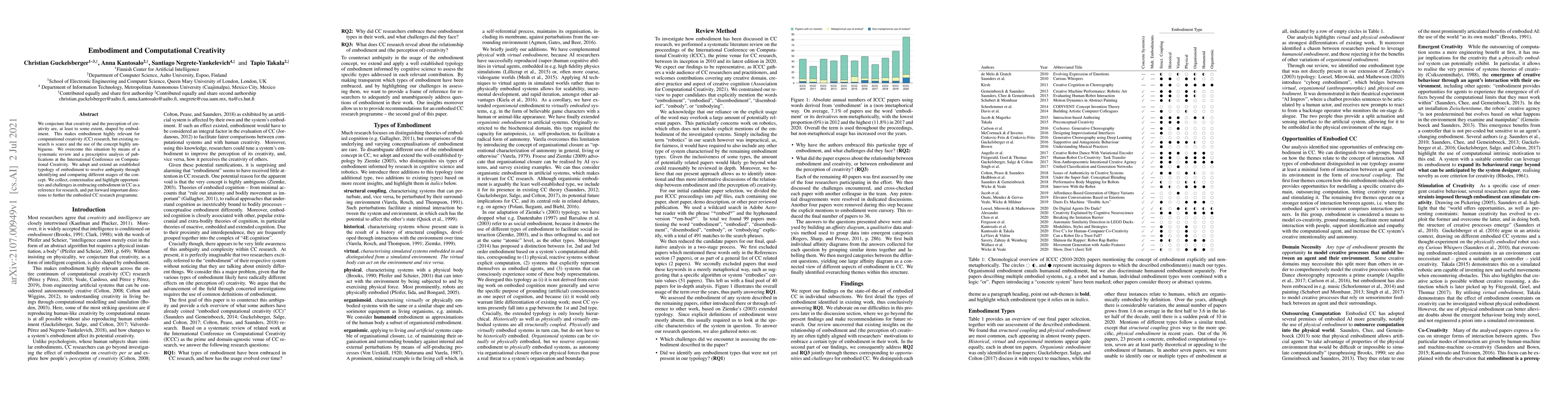 This paper systematically reviews the role of embodiment in computational creativity, identifying ambiguities in its use and proposing a typology to clarify its application. It highlights opportunities and challenges for future research in this area, suggesting important directions for advancing embodied computational creativity.