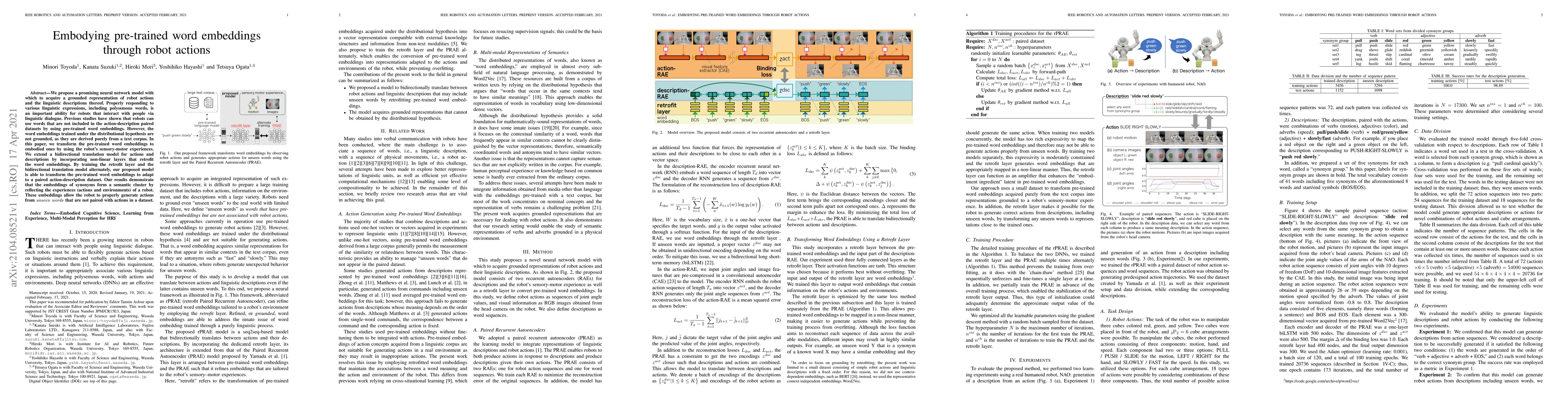 We propose a promising neural network model with which to acquire a grounded representation of robot actions and the linguistic descriptions thereof. Properly responding to various linguistic expressions, including polysemous words, is an important ability for robots that interact with people via linguistic dialogue. Previous studies have shown that robots can use words that are not included in the action-description paired datasets by using pre-trained word embeddings. However, the word embeddings trained under the distributional hypothesis are not grounded, as they are derived purely from a text corpus. In this letter, we transform the pre-trained word embeddings to embodied ones by using the robot's sensory-motor experiences. We extend a bidirectional translation model for actions and descriptions by incorporating non-linear layers that retrofit the word embeddings. By training the retrofit layer and the bidirectional translation model alternately, our proposed model is able to transform the pre-trained word embeddings to adapt to a paired action-description dataset. Our results demonstrate that the embeddings of synonyms form a semantic cluster by reflecting the experiences (actions and environments) of a robot. These embeddings allow the robot to properly generate actions from unseen words that are not paired with actions in a dataset.
