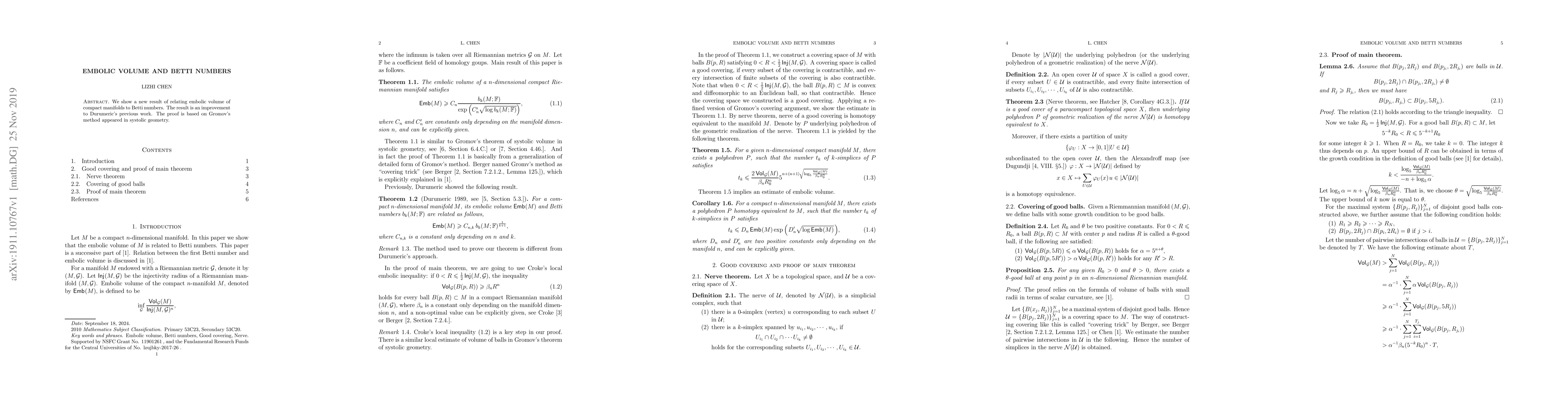 We show a new result of relating embolic volume of compact manifolds to Betti numbers. The result is an improvement to Durumeric's previous work. The proof is based on Gromov's method appeared in systolic geometry.