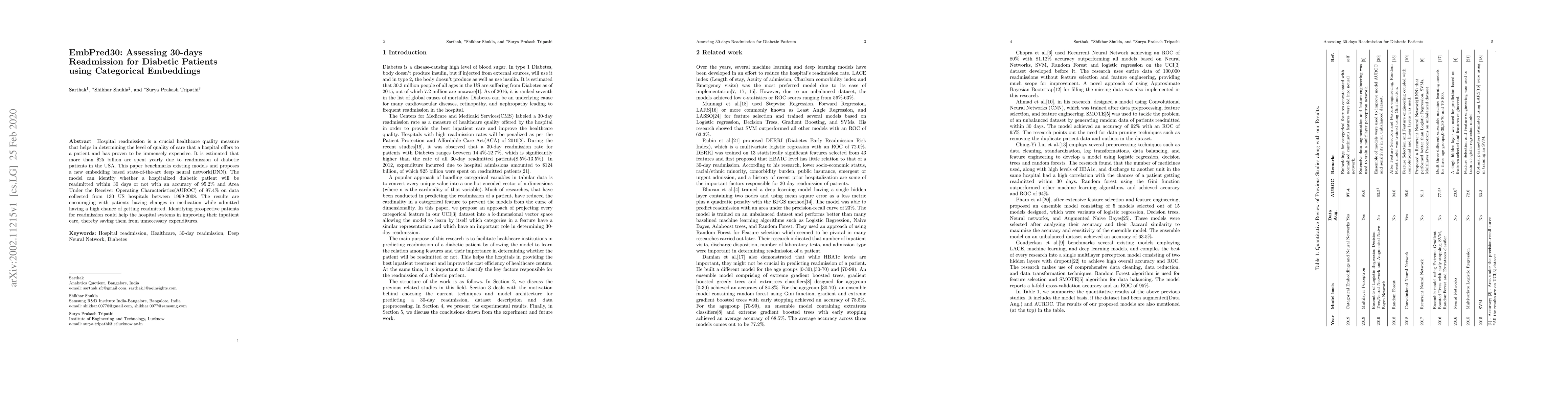 Hospital readmission is a crucial healthcare quality measure that helps in determining the level of quality of care that a hospital offers to a patient and has proven to be immensely expensive. It is estimated that more than $25 billion are spent yearly due to readmission of diabetic patients in the USA. This paper benchmarks existing models and proposes a new embedding based state-of-the-art deep neural network(DNN). The model can identify whether a hospitalized diabetic patient will be readmitted within 30 days or not with an accuracy of 95.2% and Area Under the Receiver Operating Characteristics(AUROC) of 97.4% on data collected from 130 US hospitals between 1999-2008. The results are encouraging with patients having changes in medication while admitted having a high chance of getting readmitted. Identifying prospective patients for readmission could help the hospital systems in improving their inpatient care, thereby saving them from unnecessary expenditures.