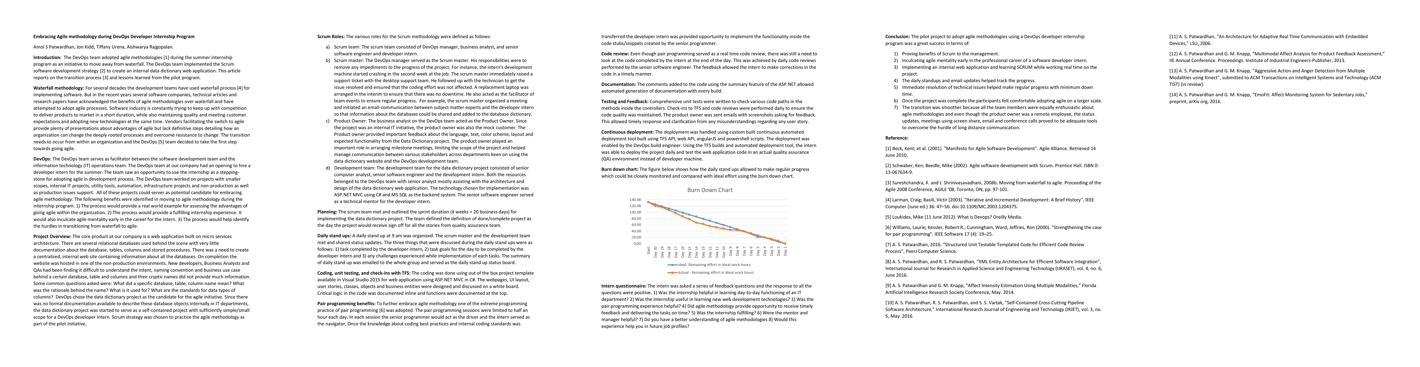 The DevOps team transitioned from waterfall to agile methodologies during a summer internship program, employing Scrum to develop a data dictionary web application. The study highlights the transition process and key lessons learned from this pilot initiative.