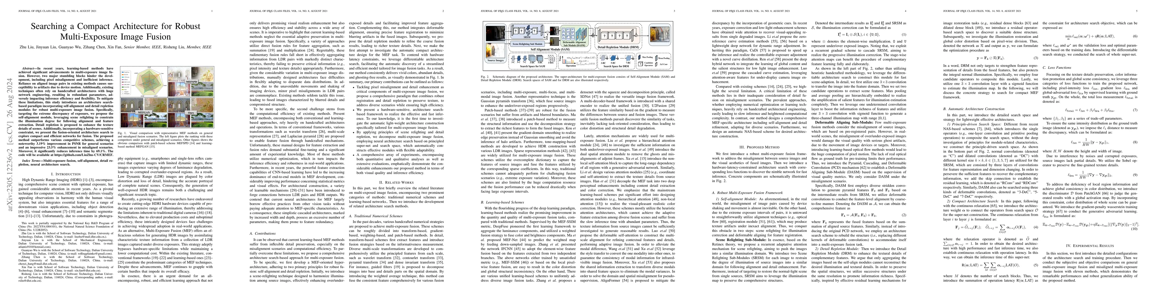 This paper proposes a search-based paradigm for multi-exposure image fusion that incorporates self-alignment and detail repletion modules to handle camera movement and device shaking. It achieves state-of-the-art performance with significant improvements in PSNR and reduced inference time by utilizing scene relighting and neural architecture search for compact network design.
