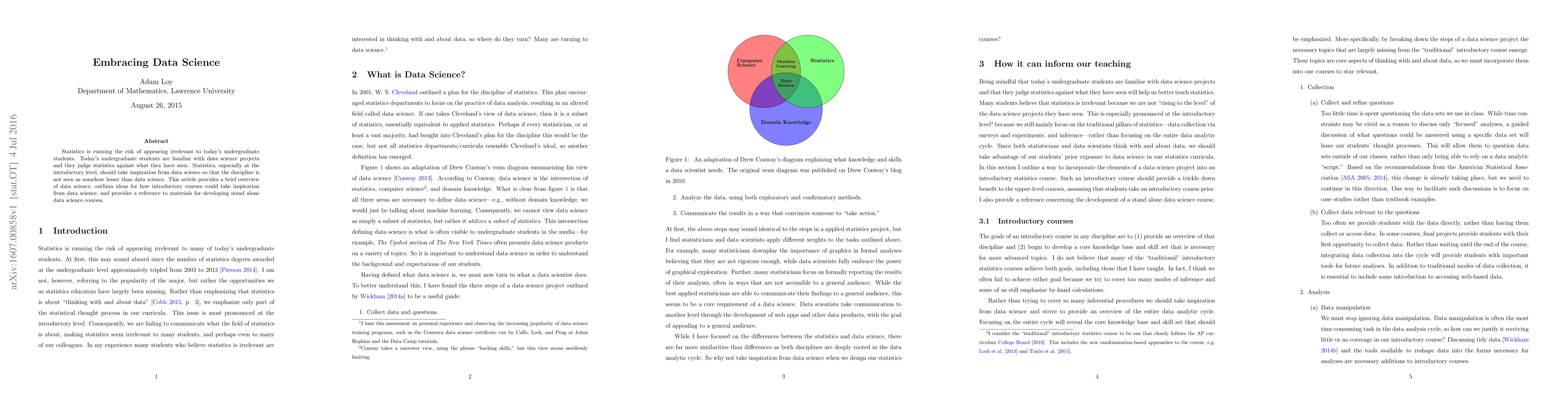 Statistics is running the risk of appearing irrelevant to today's undergraduate students. Today's undergraduate students are familiar with data science projects and they judge statistics against what they have seen. Statistics, especially at the introductory level, should take inspiration from data science so that the discipline is not seen as somehow lesser than data science. This article provides a brief overview of data science, outlines ideas for how introductory courses could take inspiration from data science, and provides a reference to materials for developing stand-alone data science courses.