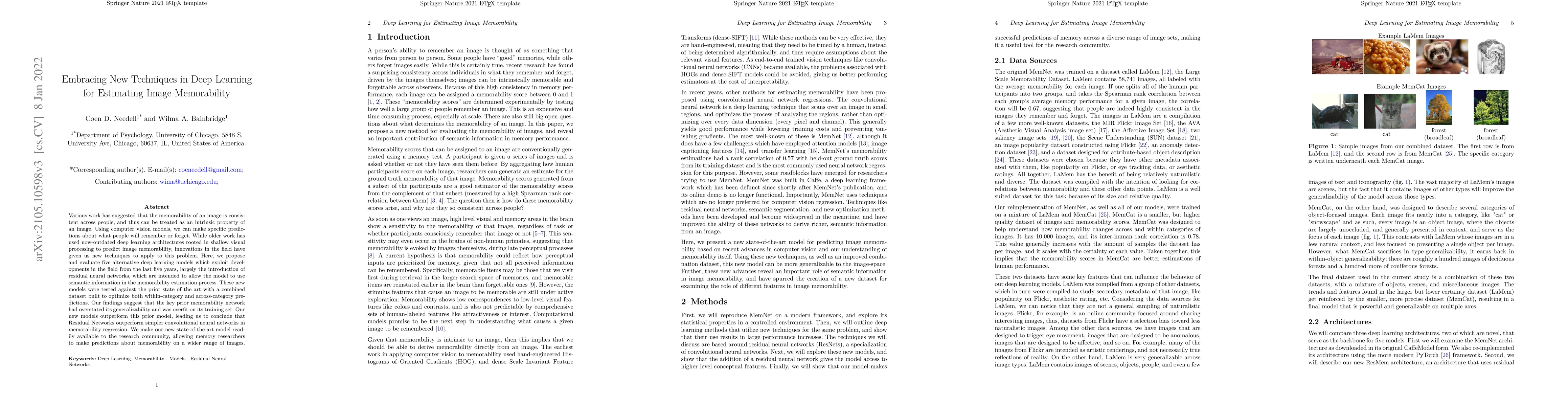 Various work has suggested that the memorability of an image is consistent across people, and thus can be treated as an intrinsic property of an image. Using computer vision models, we can make specific predictions about what people will remember or forget. While older work has used now-outdated deep learning architectures to predict image memorability, innovations in the field have given us new techniques to apply to this problem. Here, we propose and evaluate five alternative deep learning models which exploit developments in the field from the last five years, largely the introduction of residual neural networks, which are intended to allow the model to use semantic information in the memorability estimation process. These new models were tested against the prior state of the art with a combined dataset built to optimize both within-category and across-category predictions. Our findings suggest that the key prior memorability network had overstated its generalizability and was overfit on its training set. Our new models outperform this prior model, leading us to conclude that Residual Networks outperform simpler convolutional neural networks in memorability regression. We make our new state-of-the-art model readily available to the research community, allowing memory researchers to make predictions about memorability on a wider range of images.