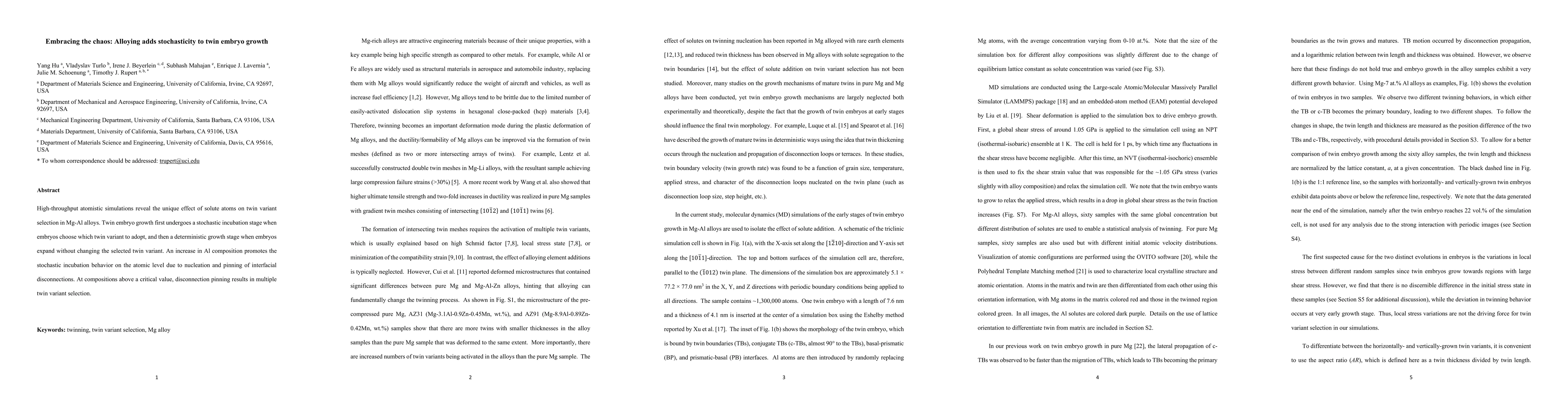 High-throughput atomistic simulations reveal the unique effect of solute atoms on twin variant selection in Mg-Al alloys. Twin embryos first undergo a stochastic incubation stage when embryos choose which twin variant to adopt, and then a deterministic growth stage when embryos expand without changing the selected twin variant. An increase in Al composition promotes the stochastic incubation behavior on the atomic level due to nucleation and pinning of interfacial disconnections. At compositions above a critical value, disconnection pinning results in multiple twin variant selection.