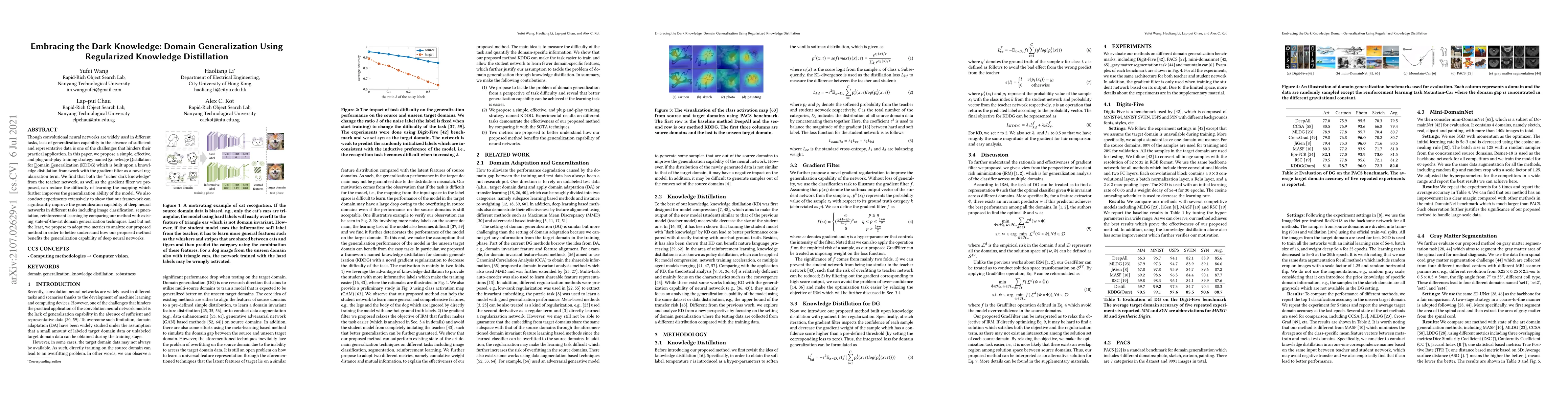 A new training strategy called Knowledge Distillation for Domain Generalization (KDDG) improves deep neural network generalization ability by leveraging 'dark knowledge' from a teacher network and a novel regularization term, achieving significant gains over existing methods in image classification, segmentation, and reinforcement learning.