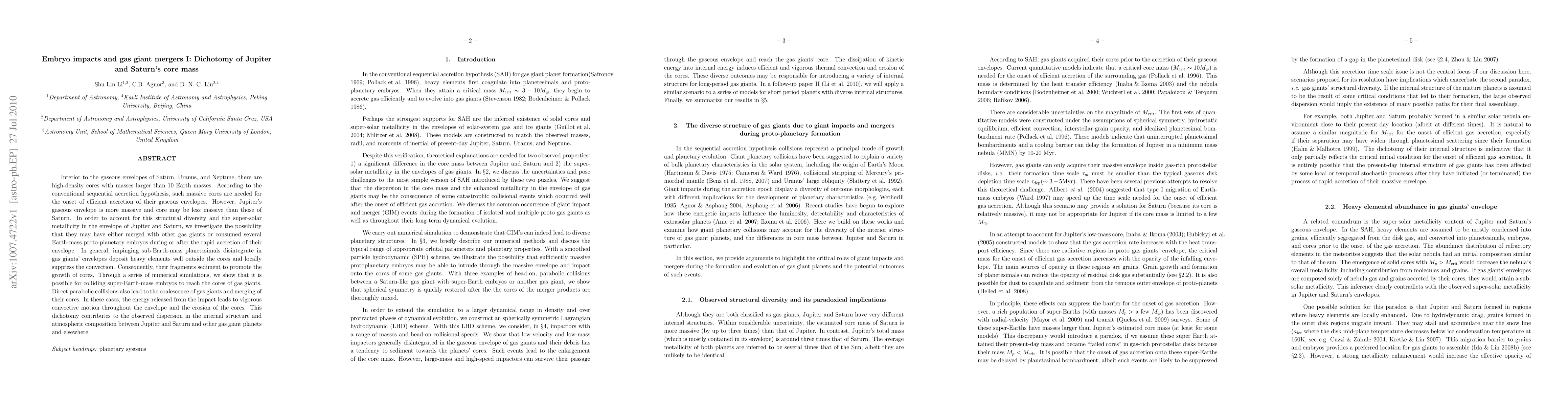 This paper explores how gas giant mergers and the consumption of proto-planetary embryos may explain the differing core masses of Jupiter and Saturn, suggesting that these processes could account for their structural diversity and super-solar metallicity. Numerical simulations show that impacts from super-Earth-mass embryos and direct gas giant collisions can significantly alter their internal structures and atmospheric compositions.