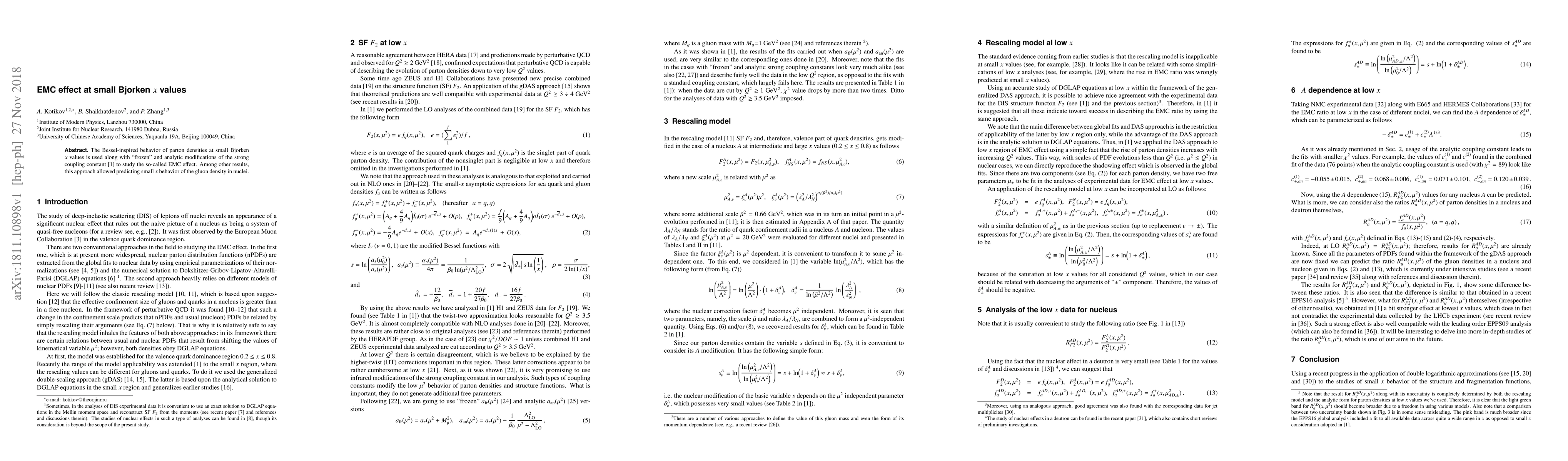 The Bessel-inspired behavior of parton densities at small Bjorken x values is used along with `frozen' and analytic modifications of the strong coupling constant [1] to study the so-called EMC effect. Among other results, this approach allowed predicting small x behavior of the gluon density in nuclei.
