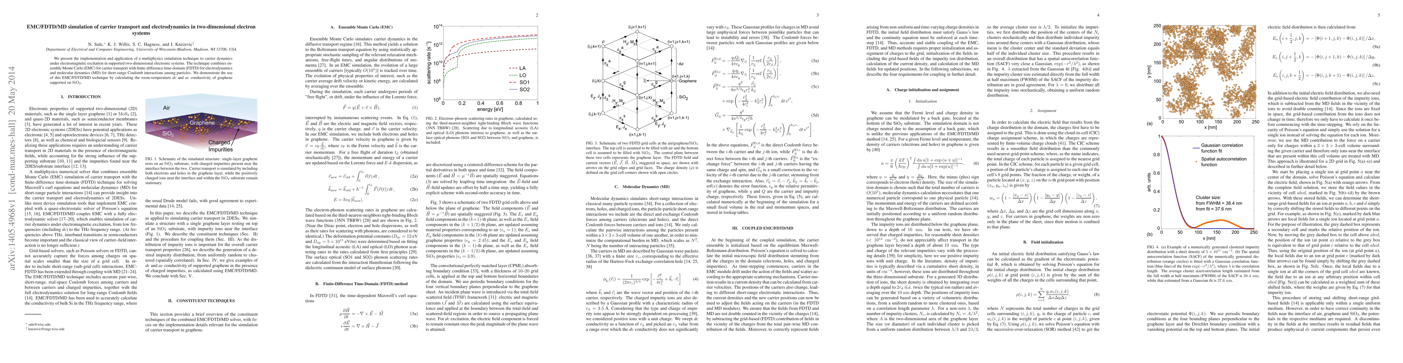 This paper introduces a multiphysics simulation technique combining EMC, FDTD, and MD to study carrier transport and electrodynamics in two-dimensional electron systems. The method is applied to calculate the dc and ac conductivity of graphene on SiO2 at room temperature.