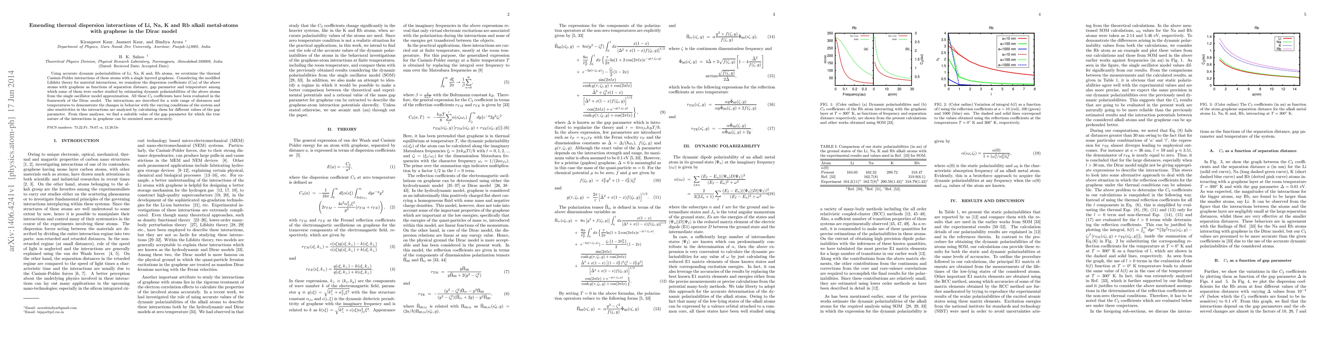 Using accurate dynamic polarizabilities of Li, Na, K and, Rb atoms, we scrutinize the thermal Casimir-Polder interactions of these atoms with a single layered graphene. Considering the modified Lifshitz theory for material interactions, we reanalyze the dispersion coefficients ($C_3$s) of the above atoms with graphene as functions of separation distance, gap parameter and temperature among which some of them were earlier studied by estimating dynamic polarizabilities of the above atoms from the single oscillator model approximation. All these $C_3$ coefficients have been evaluated in the framework of the Dirac model. The interactions are described for a wide range of distances and temperatures to demonstrate the changes in behavior with the varying conditions of the system and also sensitivities in the interactions are analyzed by calculating them for different values of the gap parameter. From these analyses, we find a suitable value of the gap parameter for which the true nature of the interactions in graphene can be surmised more accurately.