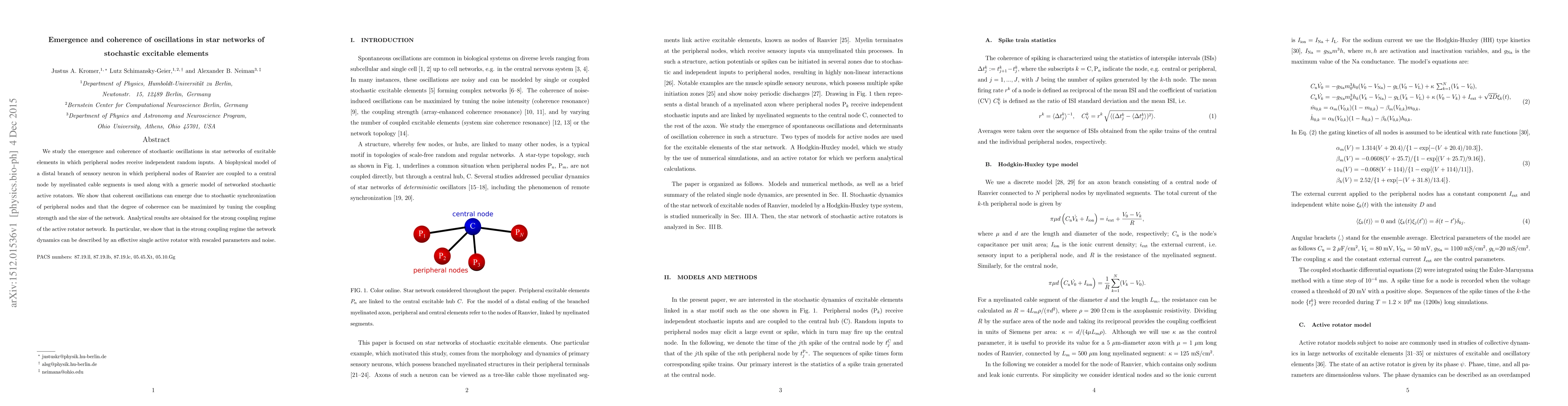 We study the emergence and coherence of stochastic oscillations in star networks of excitable elements in which peripheral nodes receive independent random inputs. A biophysical model of a distal branch of sensory neuron in which peripheral nodes of Ranvier are coupled to a central node by myelinated cable segments is used along with a generic model of networked stochastic active rotators. We show that coherent oscillations can emerge due to stochastic synchronization of peripheral nodes and that the degree of coherence can be maximized by tuning the coupling strength and the size of the network. Analytical results are obtained for the strong coupling regime of the active rotator network. In particular, we show that in the strong coupling regime the network dynamics can be described by an effective single active rotator with rescaled parameters and noise.