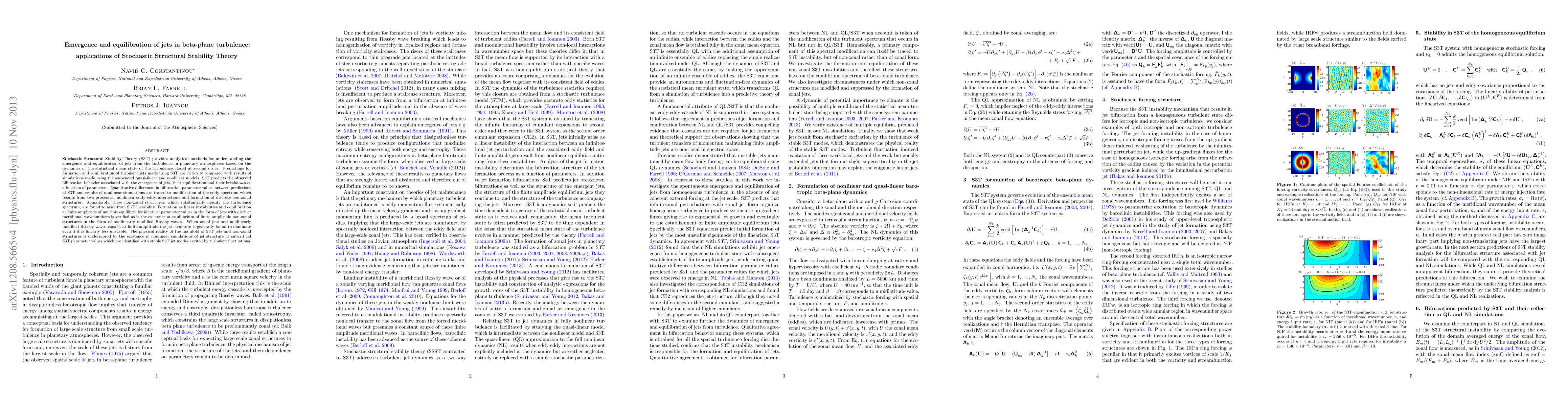 Stochastic Structural Stability Theory (S3T) provides analytical methods for understanding the emergence and equilibration of jets from the turbulence in planetary atmospheres based on the dynamics of the statistical mean state of the turbulence closed at second order. Predictions for formation and equilibration of turbulent jets made using S3T are critically compared with results of simulations made using the associated quasi-linear and nonlinear models. S3T predicts the observed bifurcation behavior associated with the emergence of jets, their equilibration and their breakdown as a function of parameters. Quantitative differences in bifurcation parameter values between predictions of S3T and results of nonlinear simulations are traced to modification of the eddy spectrum which results from two processes: nonlinear eddy-eddy interactions and formation of discrete non-zonal structures. Remarkably, these non-zonal structures, which substantially modify the turbulence spectrum, are found to arise from S3T instability. Formation as linear instabilities and equilibration at finite amplitude of multiple equilibria for identical parameter values in the form of jets with distinct meridional wavenumbers is verified as is the existence at equilibrium of finite amplitude non-zonal structures in the form of nonlinearly modified Rossby waves. When zonal jets and nonlinearly modified Rossby waves coexist at finite amplitude the jet structure is generally found to dominate even if it is linearly less unstable. The physical reality of the manifold of S3T jets and non-zonal structures is underscored by the existence in nonlinear simulations of jet structure at subcritical S3T parameter values which are identified with stable S3T jet modes excited by turbulent fluctuations.