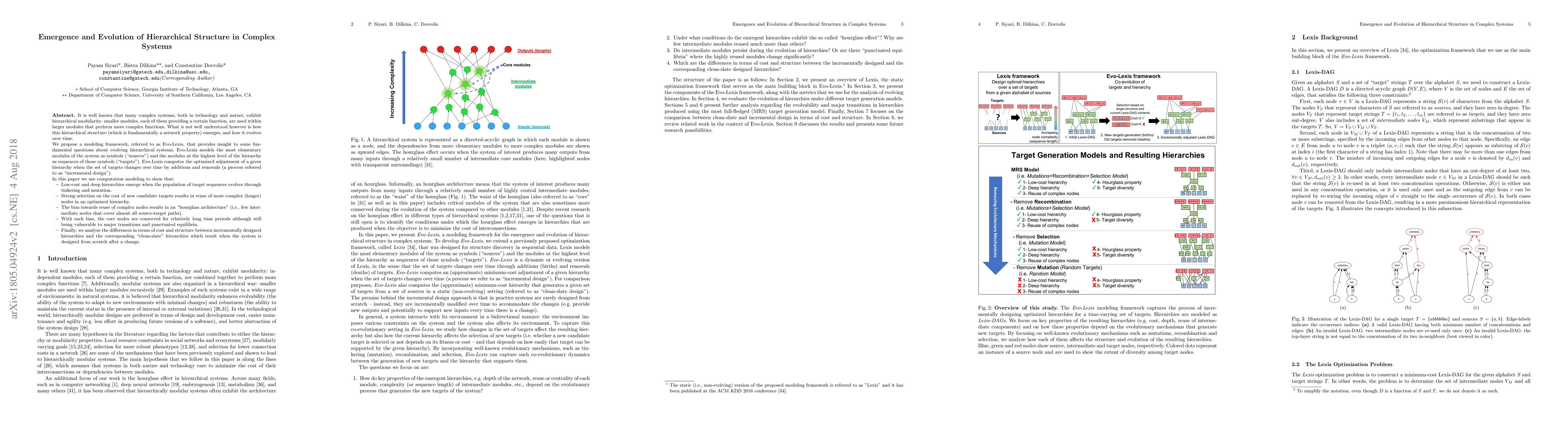 This paper introduces Evo-Lexis, a modeling framework to study the emergence and evolution of hierarchical structures in complex systems. It demonstrates that low-cost, deep hierarchies arise through incremental design via tinkering and mutation, and that strong selection favors the reuse of complex nodes, leading to an hourglass architecture and long-term conservation of core nodes despite vulnerability to major transitions.