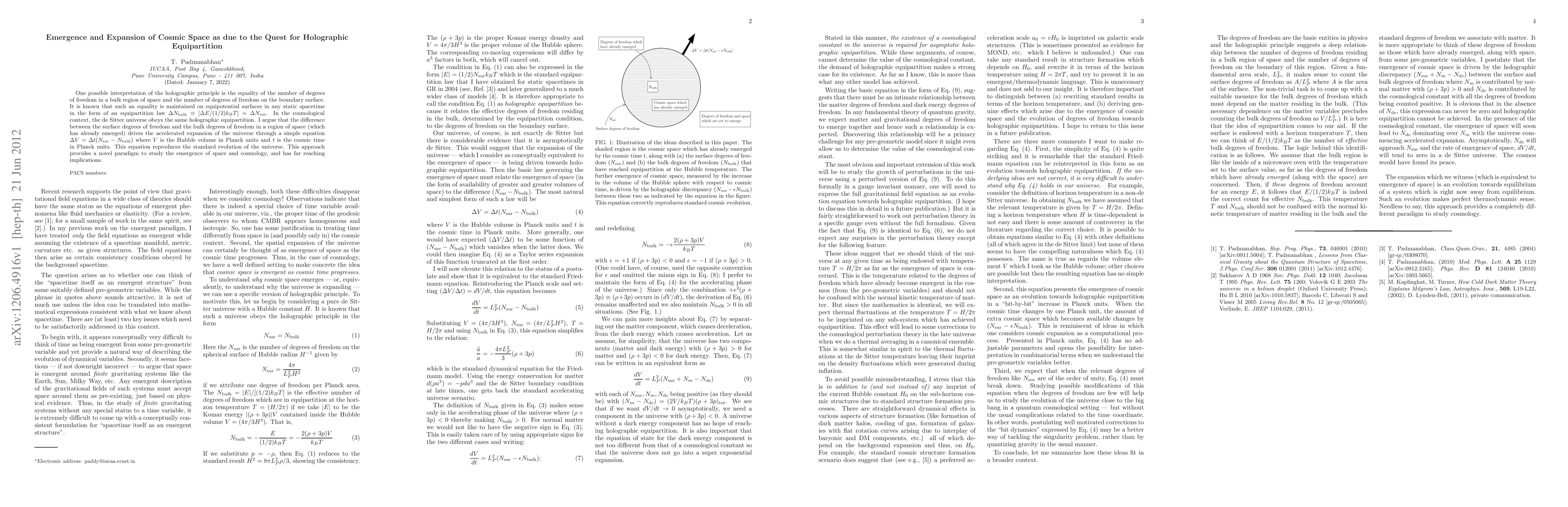 One possible interpretation of the holographic principle is the equality of the number of degrees of freedom in a bulk region of space and the number of degrees of freedom on the boundary surface. It is known that such an equality is maintained on equipotential surfaces in any static spacetime in the form of an equipartition law N_{bulk}= N_{sur}. In the cosmological context, the de Sitter universe obeys the same holographic equipartition. I argue that the difference between the surface degrees of freedom and the bulk degrees of freedom in a region of space (which has already emerged) drives the accelerated expansion of the universe through a simple equation dV/dt = (N_{sur} - N_{bulk}) where V is the Hubble volume in Planck units and t is the cosmic time in Planck units. This equation reproduces the standard evolution of the universe. This approach provides a novel paradigm to study the emergence of space and cosmology and has far reaching implications.