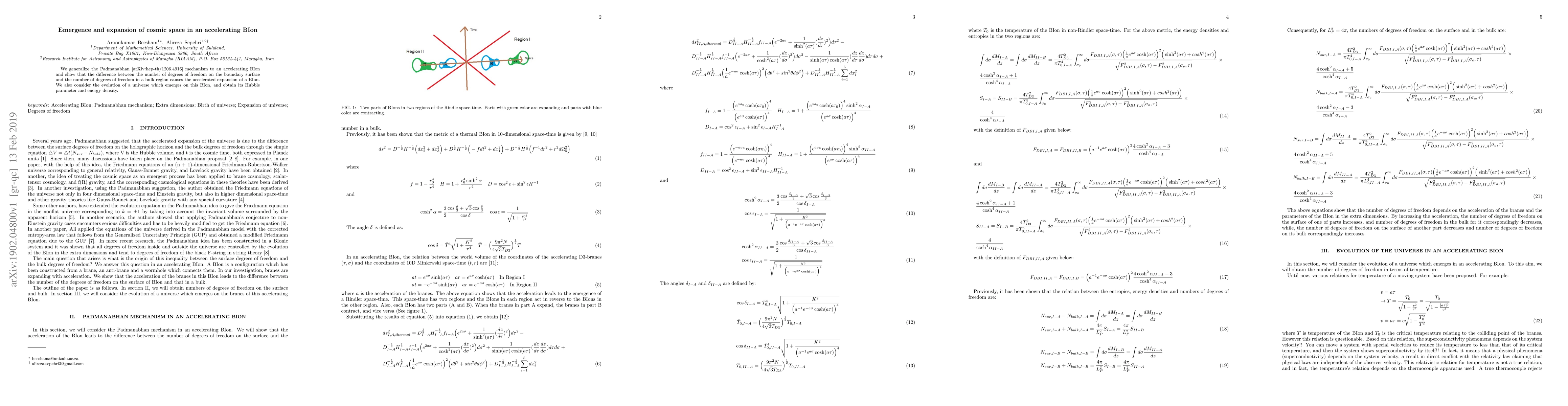 We generalize the Padmanabhan [arXiv:hep-th/1206.4916] mechanism to an accelerating BIon and show that the difference between the number of degrees of freedom on the boundary surface and the number of degrees of freedom in a bulk region causes the accelerated expansion of a BIon. We also consider the evolution of a universe which emerges on this BIon, and obtain its Hubble parameter and energy density.