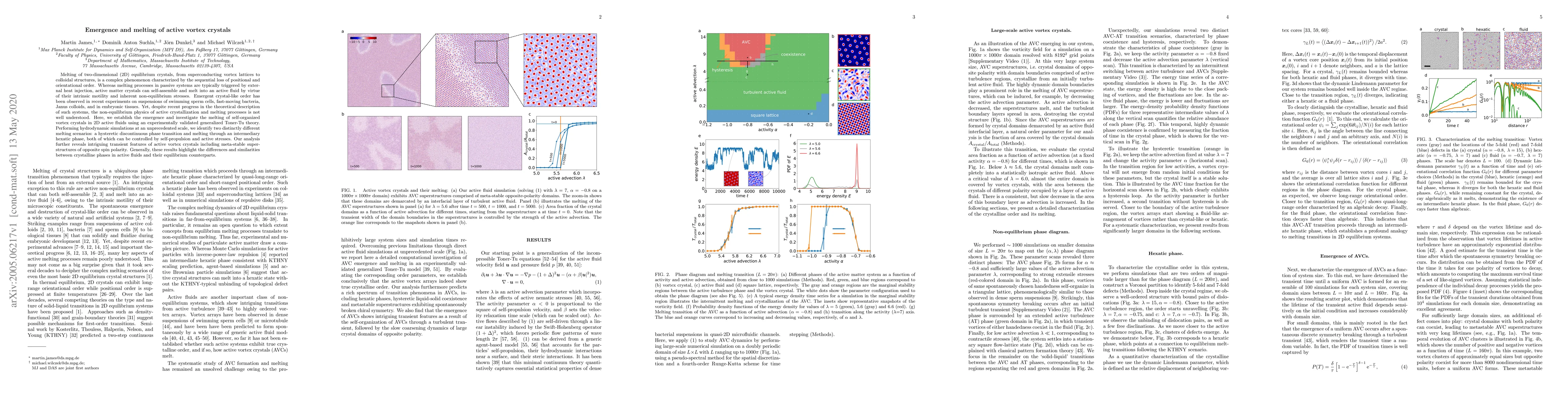 This paper explores the emergence and melting of self-organized vortex crystals in two-dimensional active fluids using hydrodynamic simulations and generalized Toner-Tu theory. It identifies two distinct melting scenarios, controlled by self-propulsion and active stresses, highlighting differences and similarities between active and passive crystalline phases.