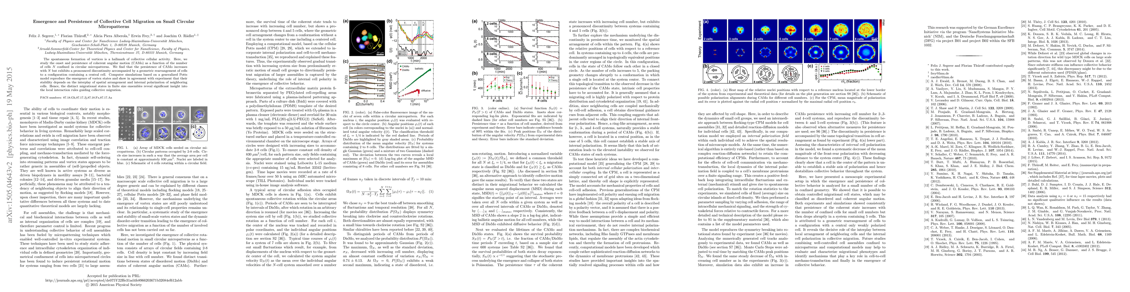 This study investigates how the number of cells in circular micropatterns influences the onset and persistence of collective cellular migration, revealing a discontinuity in persistence linked to a central cell configuration. Simulations using a generalized Potts model confirm that the stability of vortex states depends on the spatial arrangement and internal polarization of cells, providing insights into the interaction rules governing collective migration.