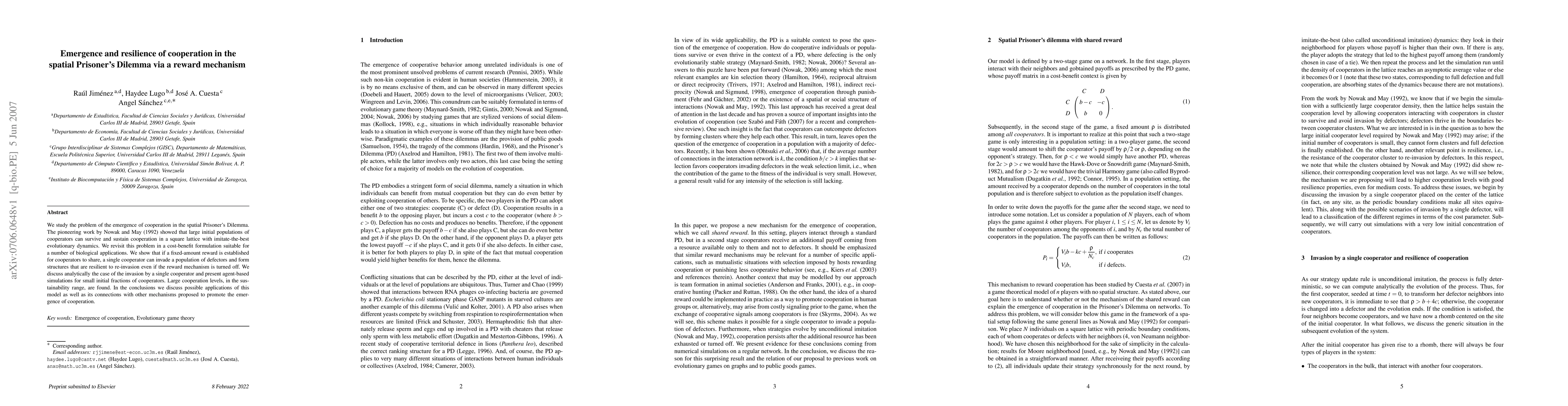 This paper explores how cooperation can emerge in the spatial Prisoner's Dilemma through a reward mechanism, demonstrating that even a single cooperator can establish resilient cooperative structures when rewarded, and discusses potential biological applications and connections to other cooperation-promoting mechanisms.