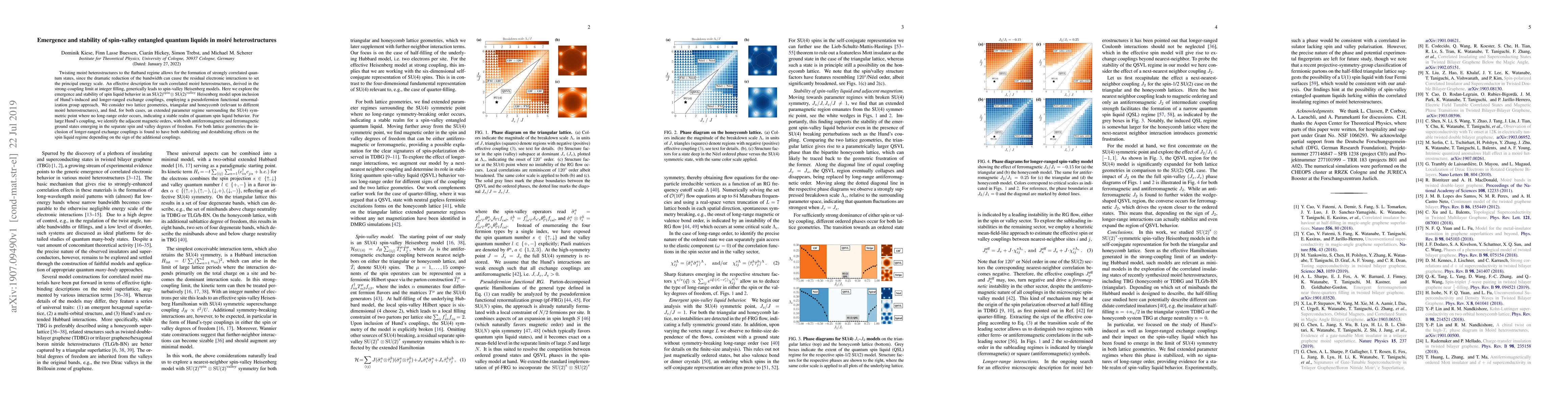 Twisting moir\'e heterostructures to the flatband regime allows for the formation of strongly correlated quantum states, since the dramatic reduction of the bandwidth can cause the residual electronic interactions to set the principal energy scale. An effective description for such correlated moir\'e heterostructures, derived in the strong-coupling limit at integer filling, generically leads to spin-valley Heisenberg models. Here we explore the emergence and stability of spin liquid behavior in an SU(2)$^{\mathrm{spin}}\otimes$SU(2)$^{\mathrm{valley}}$ Heisenberg model upon inclusion of Hund's-induced and longer-ranged exchange couplings, employing a pseudofermion functional renormalization group approach. We consider two lattice geometries, triangular and honeycomb (relevant to different moir\'e heterostructures), and find, for both cases, an extended parameter regime surrounding the SU(4) symmetric point where no long-range order occurs, indicating a stable realm of quantum spin liquid behavior. For large Hund's coupling, we identify the adjacent magnetic orders, with both antiferromagnetic and ferromagnetic ground states emerging in the separate spin and valley degrees of freedom. For both lattice geometries the inclusion of longer-ranged exchange couplings is found to have both stabilizing and destabilizing effects on the spin liquid regime depending on the sign of the additional couplings.