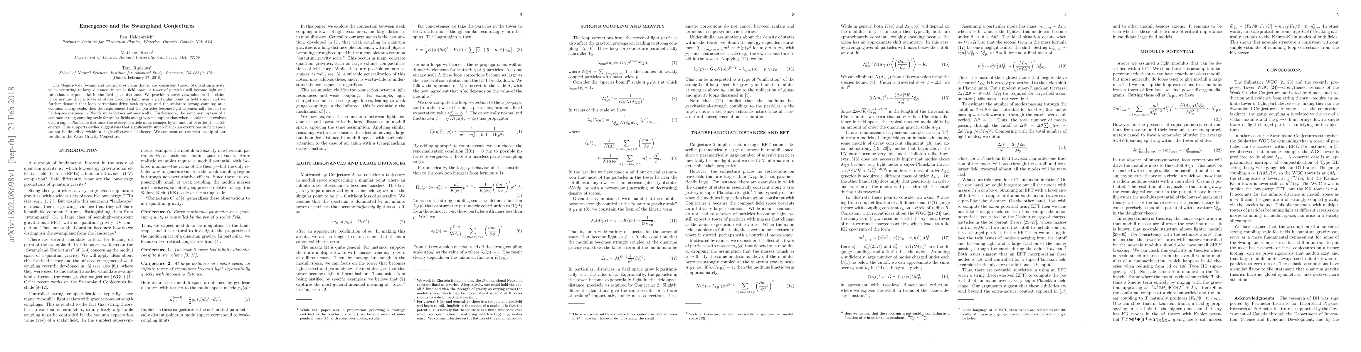 The Ooguri-Vafa Swampland Conjectures claim that in any consistent theory of quantum gravity, when venturing to large distances in scalar field space, a tower of particles will become light at a rate that is exponential in the field space distance. We provide a novel viewpoint on this claim: if we assume that a tower of states becomes light near a particular point in field space, and we further demand that loop corrections drive both gravity and the scalar to strong coupling at a common energy scale, then the requirement that the particles become light exponentially fast in the field-space distance in Planck units follows automatically. Furthermore, the same assumption of a common strong-coupling scale for scalar fields and gravitons implies that when a scalar field evolves over a super-Planckian distance, the average particle mass changes by an amount of order the cutoff energy. This supports earlier suggestions that significantly super-Planckian excursions in field space cannot be described within a single effective field theory. We comment on the relationship of our results to the Weak Gravity Conjecture.