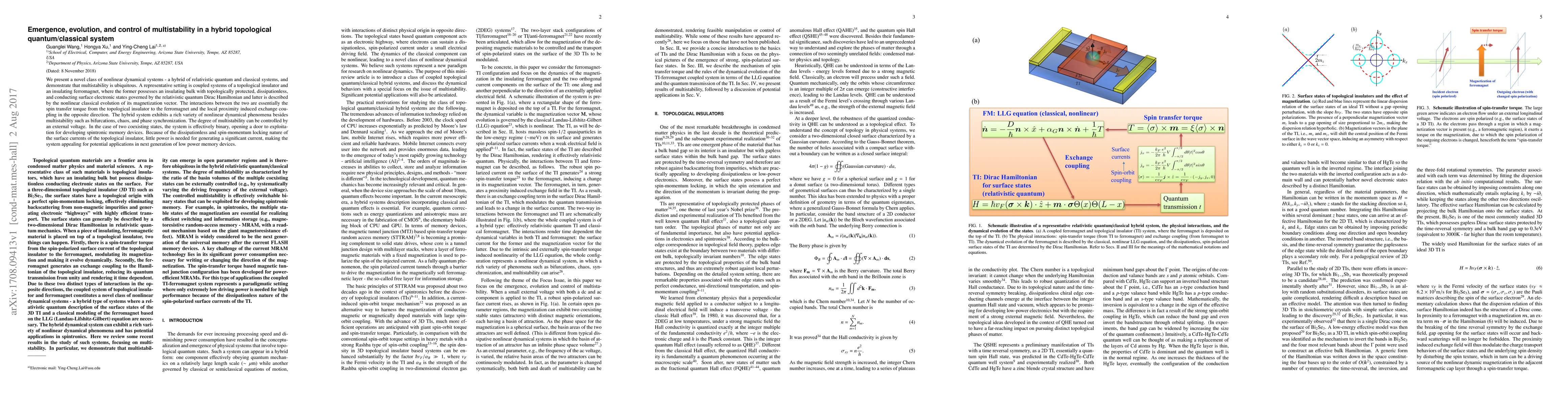This paper explores a hybrid quantum/classical system combining relativistic quantum dynamics and classical magnetization, revealing its multistability and controllability via external voltage. The system, featuring a topological insulator and an insulating ferromagnet, shows potential for low-power spintronic memory applications.