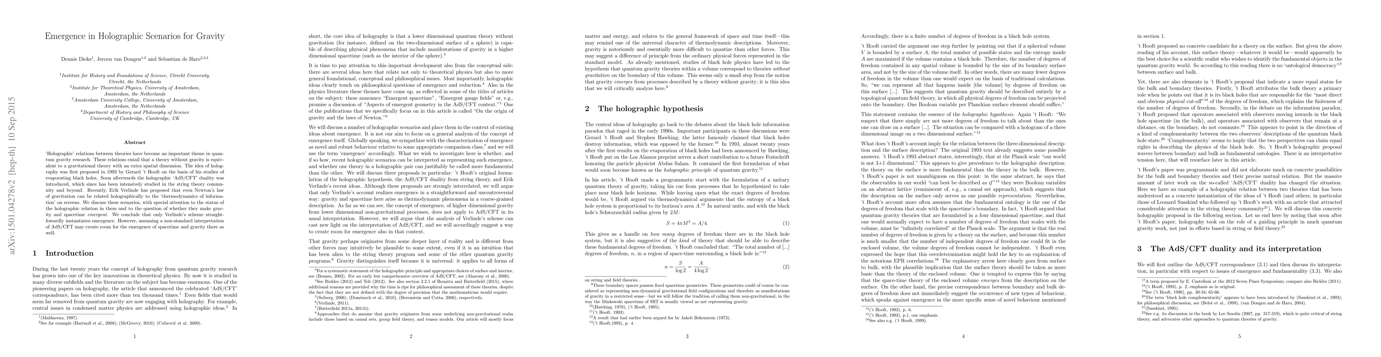 'Holographic' relations between theories have become an important theme in quantum gravity research. These relations entail that a theory without gravity is equivalent to a gravitational theory with an extra spatial dimension. The idea of holography was first proposed in 1993 by Gerard 't Hooft on the basis of his studies of evaporating black holes. Soon afterwards the holographic 'AdS/CFT' duality was introduced, which since has been intensively studied in the string theory community and beyond. Recently, Erik Verlinde has proposed that even Newton's law of gravitation can be related holographically to the `thermodynamics of information' on screens. We discuss these scenarios, with special attention to the status of the holographic relation in them and to the question of whether they make gravity and spacetime emergent. We conclude that only Verlinde's scheme straightfowardly instantiates emergence. However, assuming a non-standard interpretation of AdS/CFT may create room for the emergence of spacetime and gravity there as well.