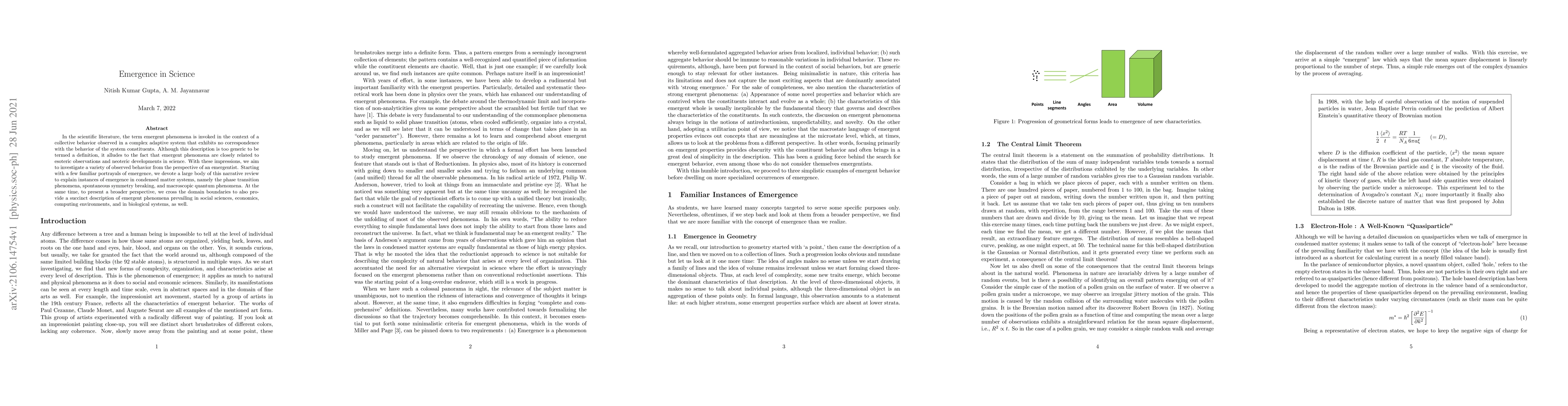 In the scientific literature, the term emergent phenomena is invoked in the context of a collective behavior observed in a complex adaptive system that exhibits no correspondence with the behavior of the system constituents. Although this description is too generic to be termed a definition, it alludes to the fact that emergent phenomena are closely related to esoteric observations and neoteric developments in science. With these impressions, we aim to investigate a variety of observed behavior from the perspective of an emergentist. Starting with a few familiar portrayals of emergence, we devote a large body of this narrative review to explain instances of emergence in condensed matter systems, namely the phase transition phenomena, spontaneous symmetry breaking, and macroscopic quantum phenomena. At the same time, to present a broader perspective, we cross the domain boundaries to also provide a succinct description of emergent phenomena prevailing in social sciences, economics, computing environments, and in biological systems, as well.