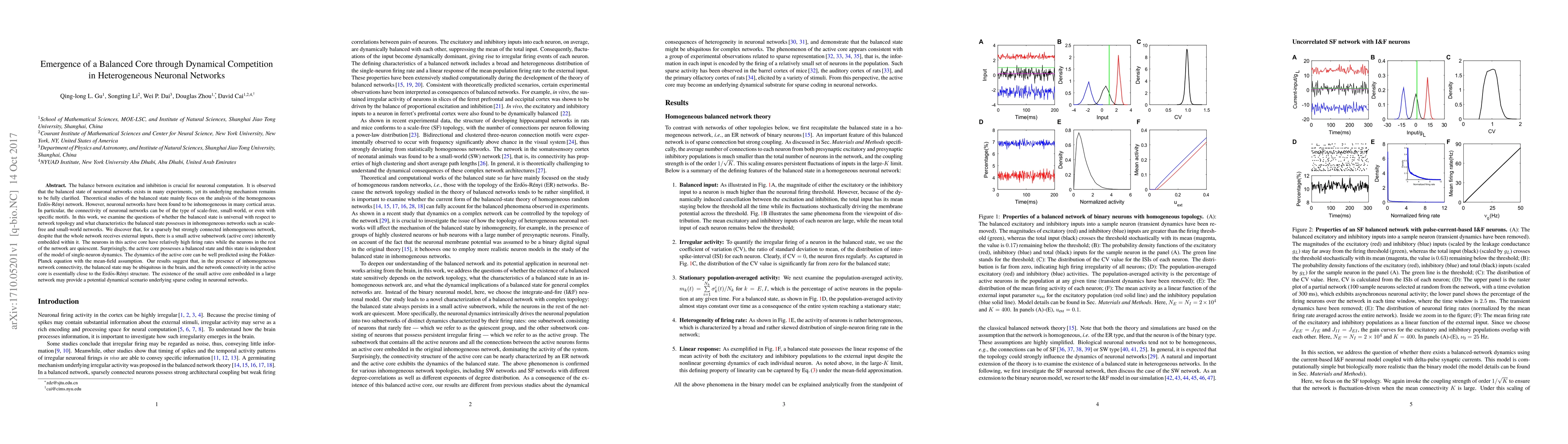 This paper explores the emergence of a balanced state in inhomogeneous neuronal networks, finding that a small active core within a sparsely but strongly connected network maintains a balanced state regardless of the network's topology. The dynamics of this core can be predicted using the Fokker-Planck equation, suggesting a universal mechanism for balance in brain networks.