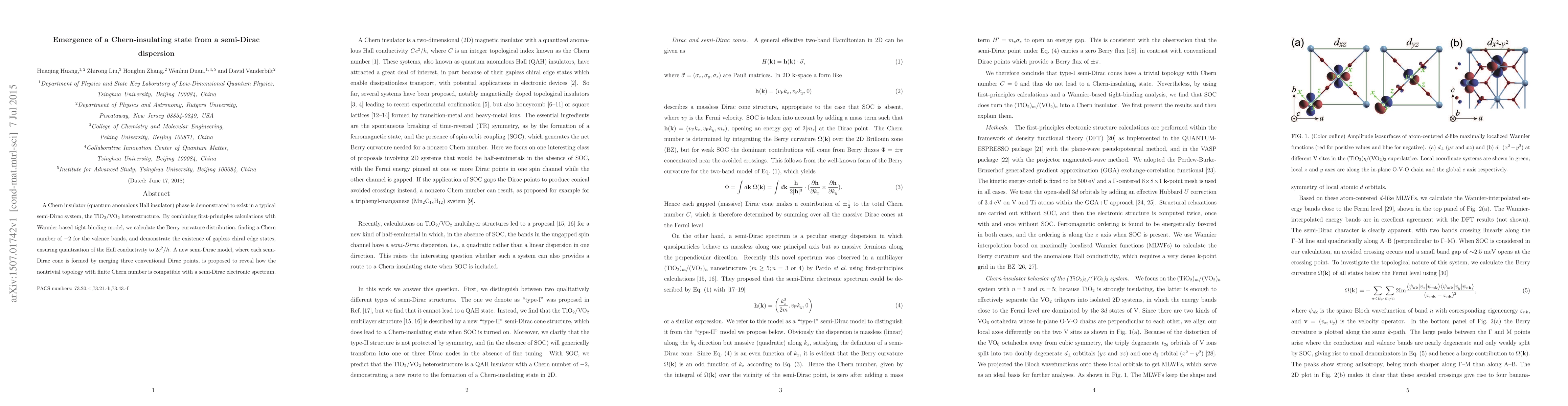 This paper demonstrates the existence of a Chern insulating state in a TiO2/VO2 heterostructure, revealing a Chern number of -2 and gapless chiral edge states. The study combines first-principles calculations and a Wannier-based tight-binding model to propose a new semi-Dirac model, explaining the compatibility of nontrivial topology with a semi-Dirac electronic spectrum.